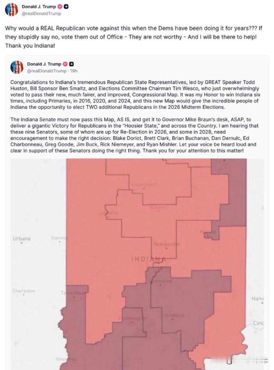 川普怒喷假共和党人反对印第安纳重划选区。 “真正的共和党人为什么要反对这件事?民主党人已经这么干了好几年!如果他们蠢到说“不”,就把他们投下去——他们不配待在位置上——而且我会亲自来帮忙! 谢谢你们,印第安纳!”