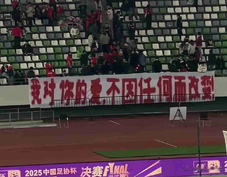 虽然足协杯比赛输球了,但河南足球不会因此而止步,我们对于你的爱也决不会因此改变! 在昨晚的足协杯决赛结束后,苏州奥体中心南看台河南球迷区上出现了这么一条标语,那就是“我对你的爱,不因任何而改变”,小编认为这就是河南足球能始终不渝坚持31年的底蕴。 这就是河南球迷对于球队的真实情感,其实真正的爱本就诞生于匮乏,淬炼于失去,忠诚于不可得,并不会依赖荣耀的加冕,也不会因为球队的胜负而改变初心。 这就是中原球迷,不管岁月如何更迭,我们对于这支球队始终会爱的深沉。这个赛季能走到今天这个地步,你们做的已经很棒了,加油![鼓掌][鼓掌][鼓掌] 带定位晒今日生活 我的今日状态:💰期待暴富 我这里的天气:🌈雨过天晴