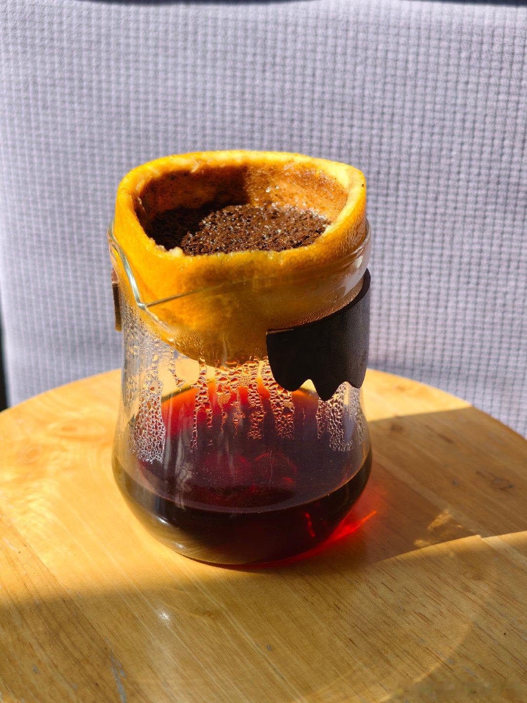 充满阳光的周末,自制橘皮手冲,可惜孔扎小了了,以至于闷蒸时间过长,有一些橘皮的苦涩味。除此之外,橙子的香气、葡萄的甜、焦糖的口感,都挺好。咖啡用的是上回西雅图带回来的中深烘豆子。 隔空干啡倨能聊