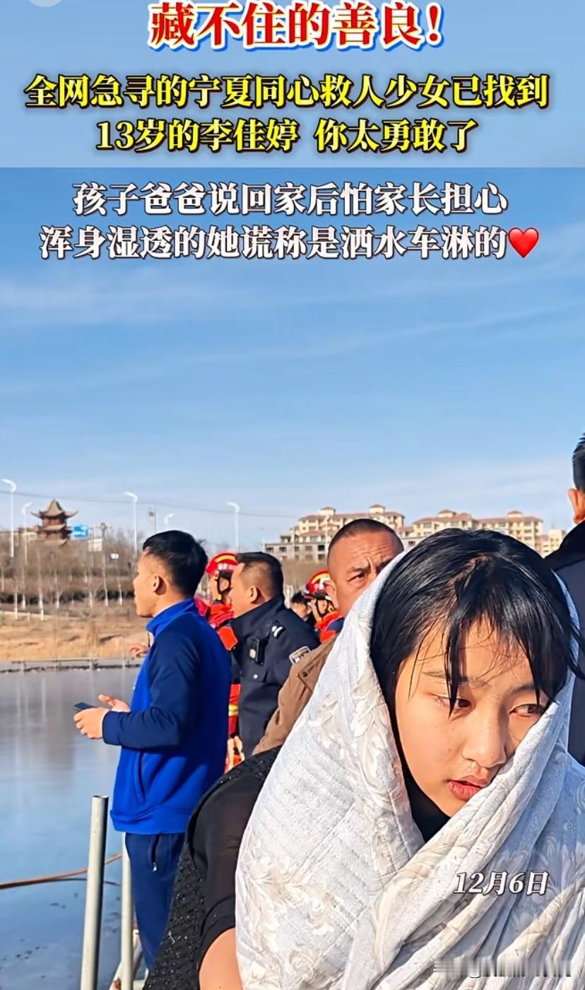 藏不住的善良!全网急寻的宁夏同心救人少女已找到!13岁的李佳婷,你太勇敢了! 大家应该是不了解事情的全貌,孩子是在众人的注视下下水的,因为冰面太薄,消防员体重超标,孩子就自告奋勇提出他下水(因为比较轻),不过她后面也被困到水里了,周围的人将她拉上来的! 少女英雄李佳婷,中华民族好儿女,是你本人让我看到祖国未来希望之星。伟大的祖国,伟大的人民,伟大的传承,这就是真正的文明灯塔。