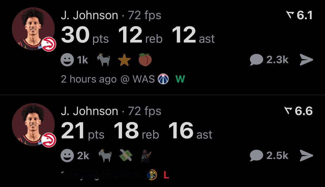突飞猛进年仅23岁的老鹰前锋杰伦·约翰逊今天超越詹姆斯,成为历史上连续两场拿到三双最年轻的前锋球员。他本赛季至今4次三双,最近5场比赛3次三双。