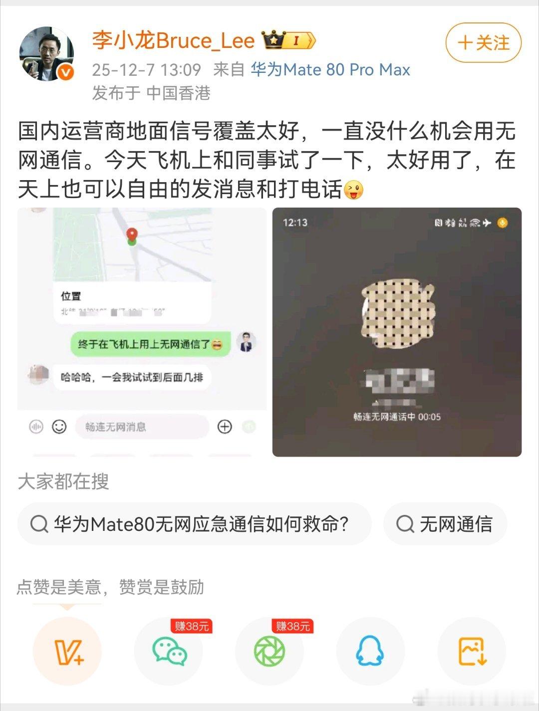 华为李小龙:在飞机上和同事测试了无网通信功能,实现了在天上也可以自由地发消息和打电话。李小龙表示,国内运营商地面信号覆盖太好,所以一直没什么机会用无网通信。