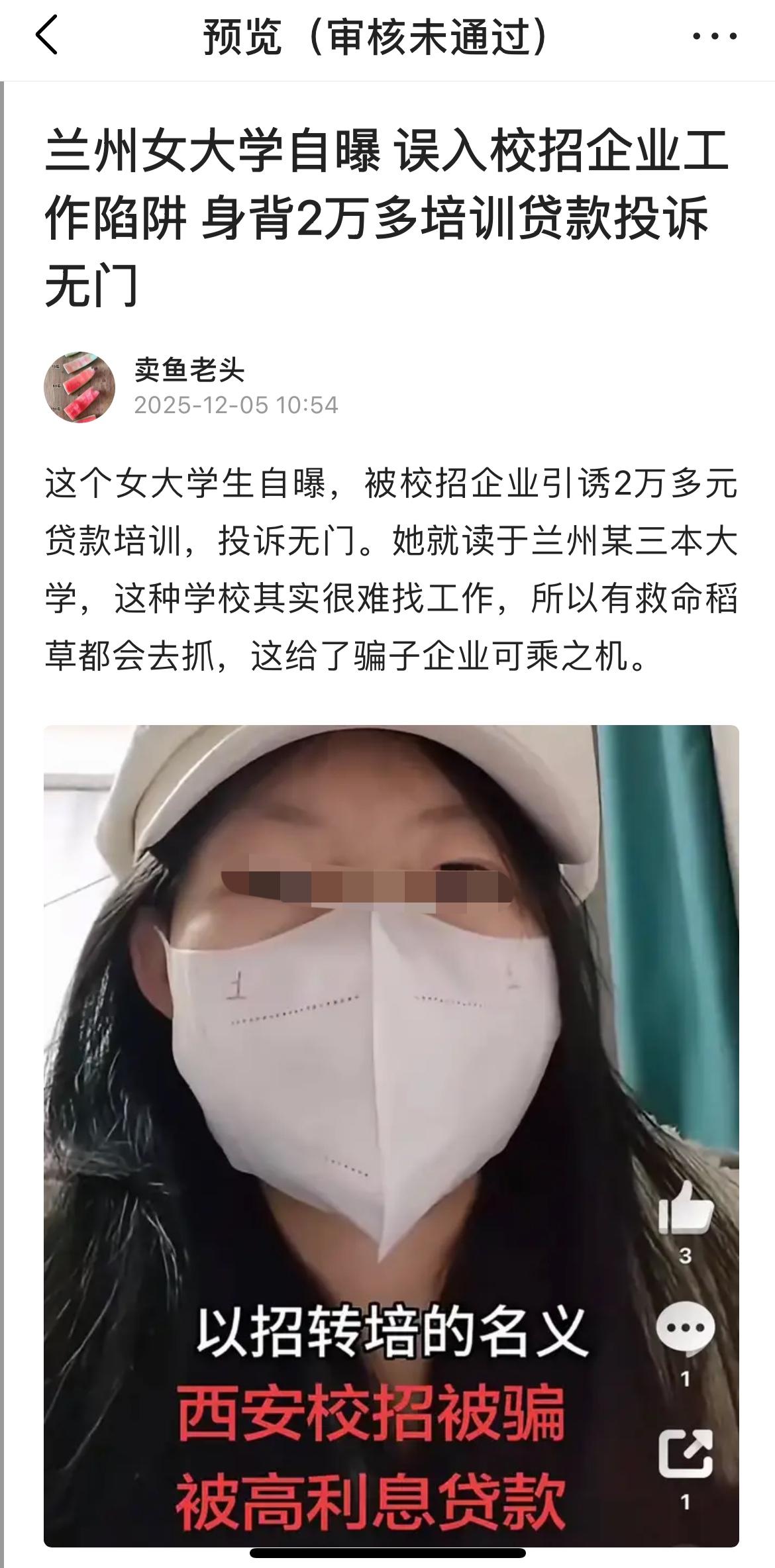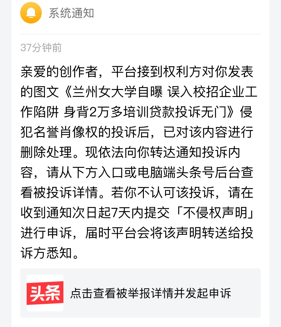 被这个叫xx悦的兰州大学生投诉,她自己发视频说被求职骗贷款,看着挺可怜,我们这些做自媒体的帮你发声,增加舆论关注度,不是挺正义的一件事吗?现在事情解决了,反手就把我们这些自媒体举报了,说侵犯她的肖像权,你都戴着遮住整张脸的口罩,谁认识你啊。你不能恩将仇报,过河拆桥吧。你可以私信我,给你删除,为啥要投诉?所以我只能说,你被骗是活该,不知好歹。征信贷款诈骗 瑧悦美女