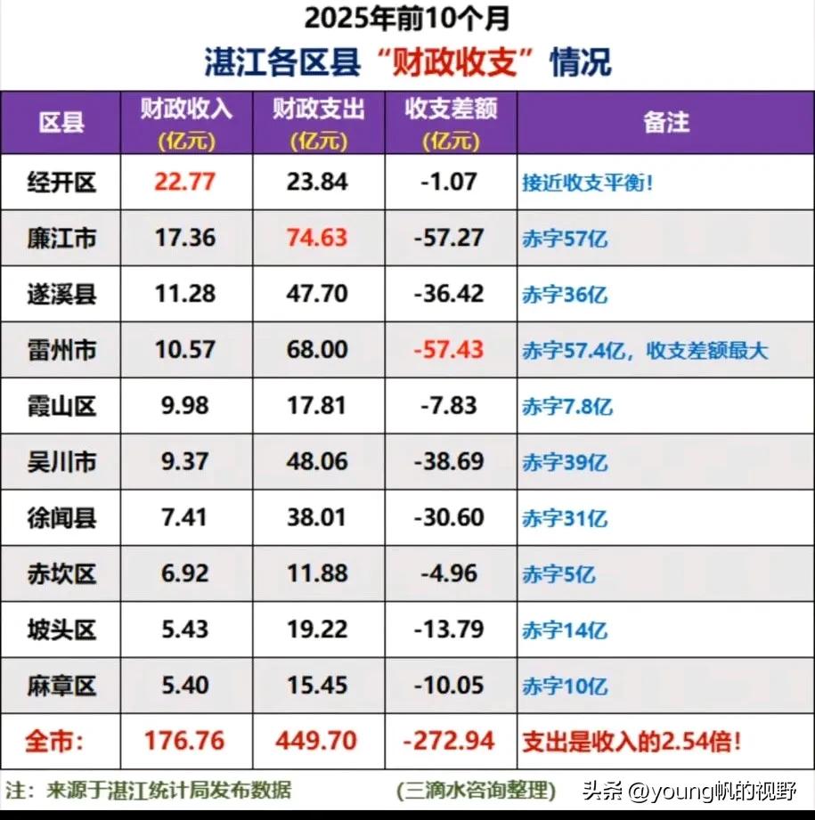 2025年前10个月湛江各区县的财政收支情况数据,从数据结果来看,湛江各地的赤字还挺多的。就连湛江下属的廉江市,还算有一些工业家底,但也面临入不敷出的局面。湛江也算是粤西地区的代表城市,这个局面也反映出粤西地区经济状况也不太好。