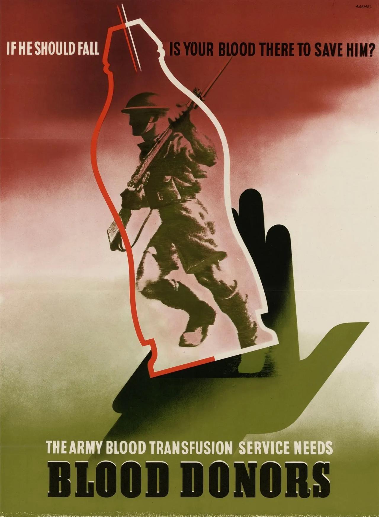 这幅二战宣传海报是军队输血服务的献血动员物料,海报顶部以问句“IF HE SHOULD FALL” “IS YOUR BLOOD THERE TO SAVE HIM?”(若他倒下,你的血能救他吗?)制造情感冲击,中间以持枪行军的士兵剪影为核心,其身形被红边白边勾勒的类似血袋(其实看着像玻璃瓶[捂脸])的轮廓框定,下方搭配伸出的黑绿色手掌,视觉上强化“献血”与“拯救士兵”的关联,底部直接点明“THE ARMY BLOOD TRANSFUSION SERVICE NEEDS BLOOD DONORS”(军队输血机关需要献血者)的核心诉求,整体以士兵安危绑定民众责任,借视觉符号与情感问句实现献血动员,是二战时期各国常见的宣传海报风格(其实到现在好像也没啥变化)。 更多精彩内容,尽在