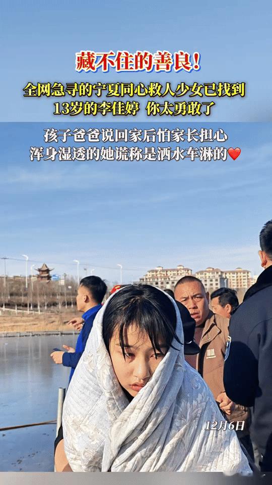 13岁少女冰湖救人后撒谎,理由暖哭全网:善良从不会被隐藏 宁夏同心的冰湖边,一个浑身湿透的13岁女孩,谎称自己是被洒水车淋的,背后却藏着一段勇敢的救人故事,暖到了无数人。 她叫李佳婷,在冰湖勇救他人后,怕家长担心,才想出了这个“洒水车”的理由。13岁的年纪,在冰冷的湖水中挺身而出,事后还小心翼翼守护家人的心,这份善良与担当,真的太让人动容了。 善良从不会被隐藏,李佳婷的勇敢和细腻,就像冬日里的一抹暖阳,照亮了人心,也让我们看到了少年身上最纯粹的美好。