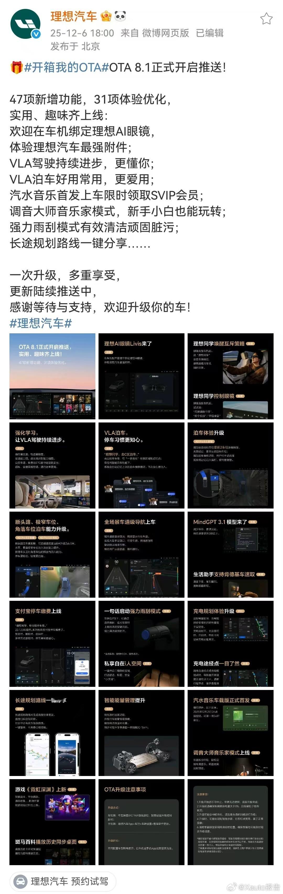 理想汽车OTA 8.1正式开启推送47项新增功能,31项体验优化,实用、趣味齐上线,欢迎在车机绑定理想AI眼镜,体验理想汽车最强附件;VLA驾驶持续进步,更懂你;VLA泊车好用常用,更爱用;汽水音乐首发上车限时领取SVIP会员;调音大师音乐家模式,新手小白也能玩转;强力雨刮模式有效清洁顽固脏污;长途规划路线一键分享……汽场全开理想汽车理想达成150万辆交付新能源汽车