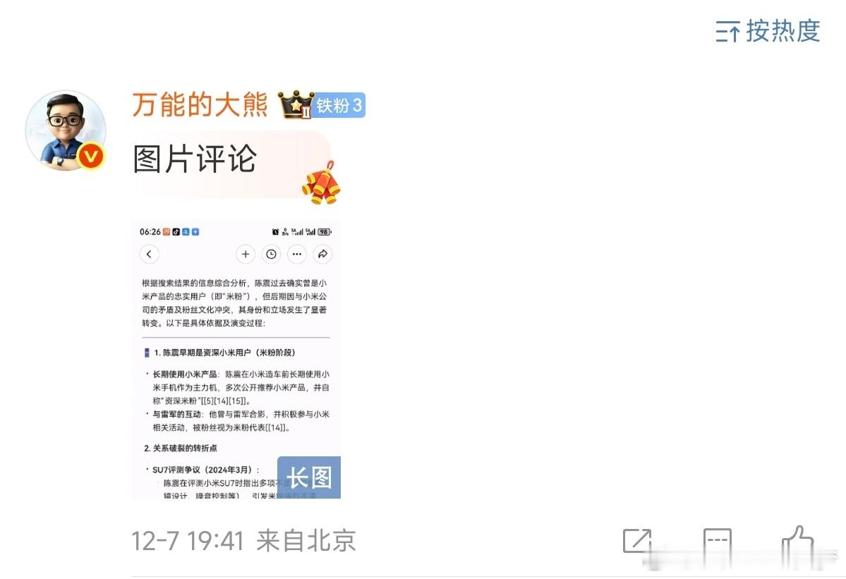 今天最绷不住的就是说陈震是米粉所以讲事情还是要放在一起来看,陈震事故帮忙洗地说落井下石的都是米粉,现在陈震偷税又说他是米粉,然后引据的来源是ai…