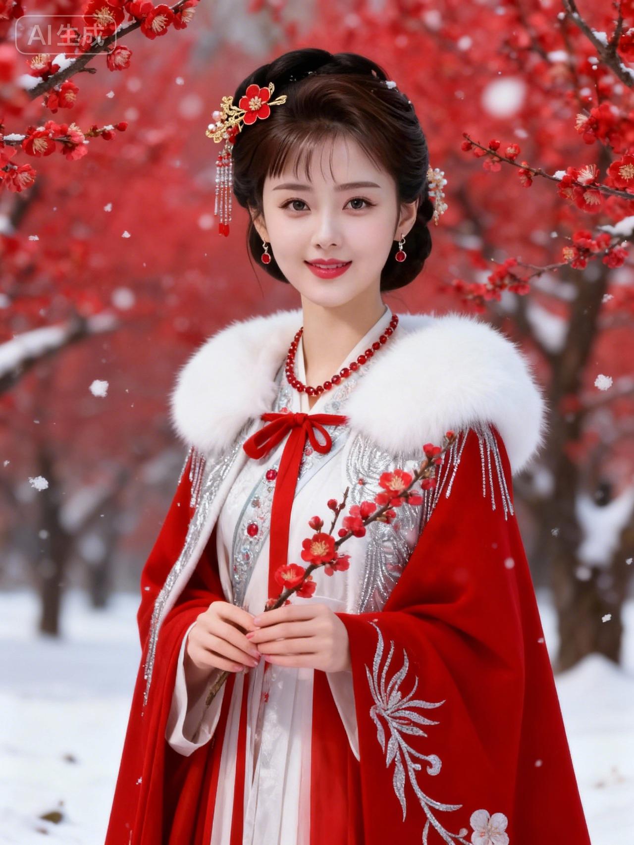 冬日雪景中的古典美人,红衣飘逸,花枝招展。