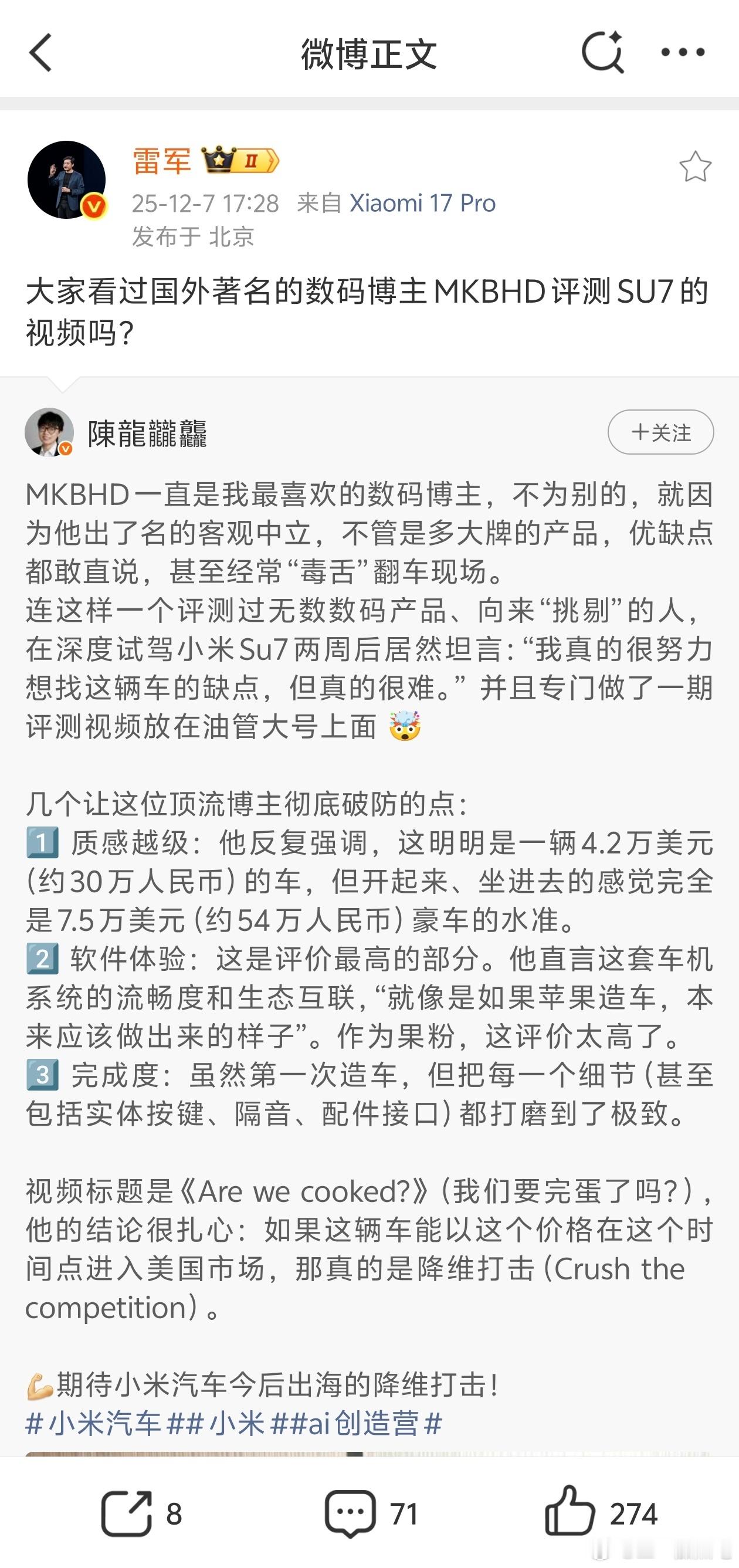 看了,但好像看得不是很完整。大v聊车(有一说一mkbhd对su7评价确实蛮高)