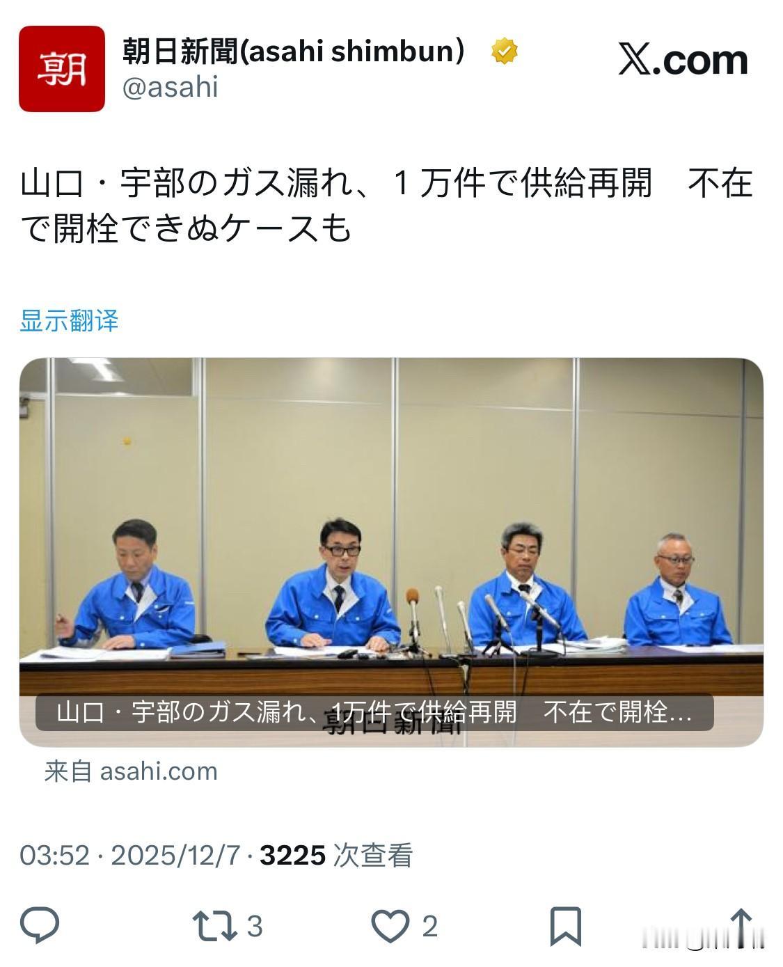 日本山口县和宇部市发生天然气泄漏事故后,1万户家庭的天然气供应已恢复。 当地时间 2025 年 12 月 4 日凌晨 4 时左右,日本山口县宇部市天然气泄漏引发超过20起火情,有两人受伤。12月4日,天然气公司召开记者会道歉称,事故原因是压力异常,数值是正常值的12倍。 当地有居民称,哪怕关闭灶具阀门也会泄漏,有人家的厨房已烧成焦黑。天然气公司暂时停供,近1.25万用户受影响。一些餐馆被迫停业,有学校午餐也用袋装防灾食品救急。