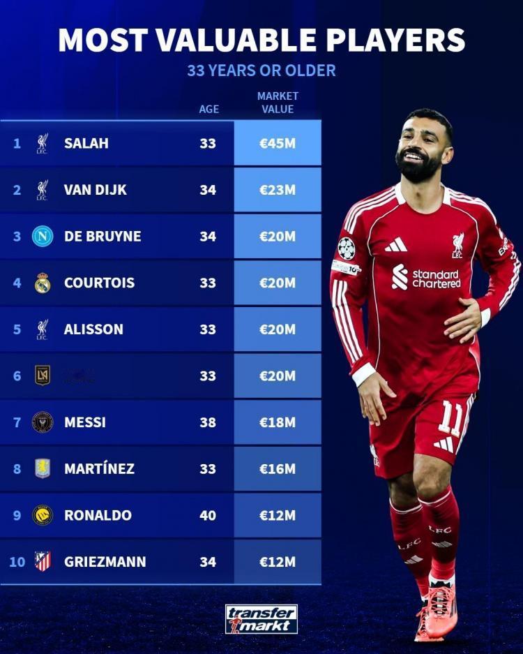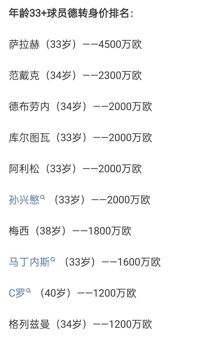 德转33+球员身价榜:萨拉赫4500万欧居首,梅西1800万欧第7、C罗1200万欧第9 12月7日 德转市场统计了年龄33+球员的身价榜单:萨拉赫4500万欧居首,范戴克2300万欧第二,孙兴慜2000万欧第六,梅西1800万欧第七,C罗1200万欧第九