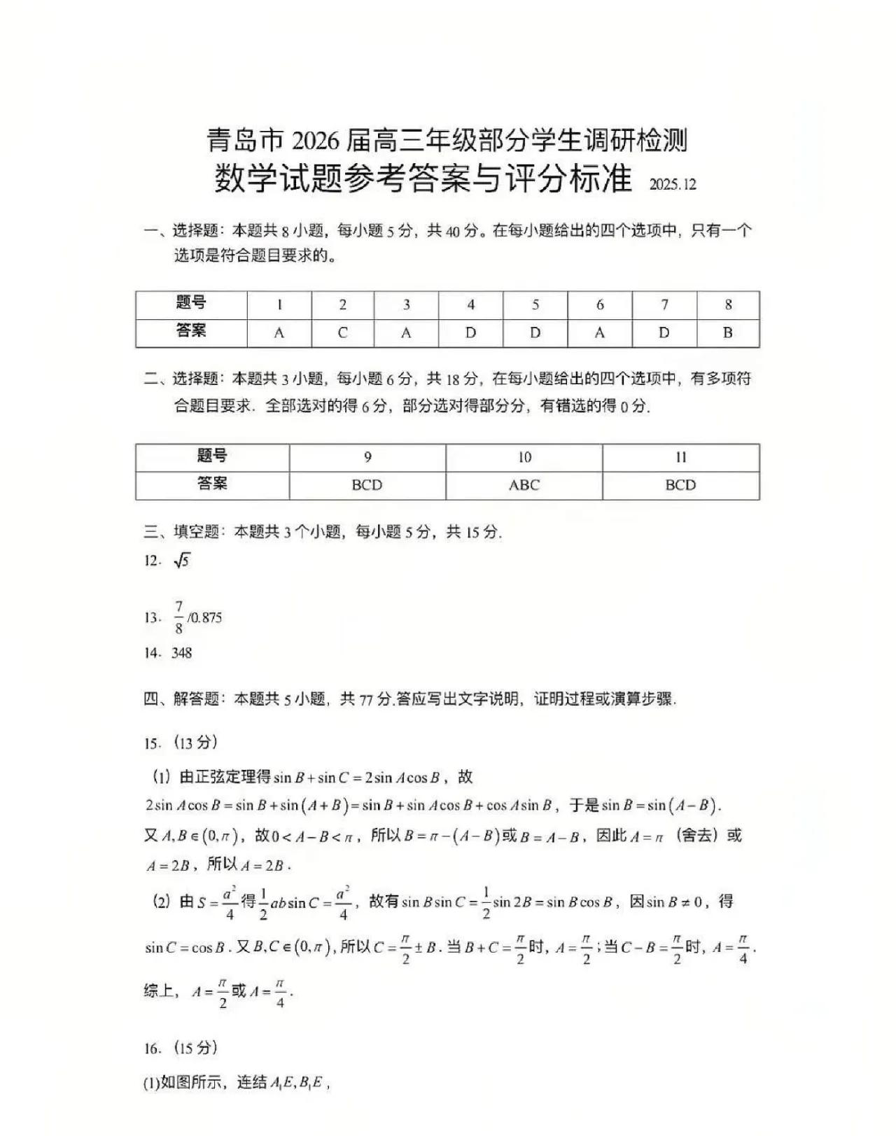 2023级青岛市部分学生期中考试和广东省普通高中高三12月第二次调研数学大题及其答案。
