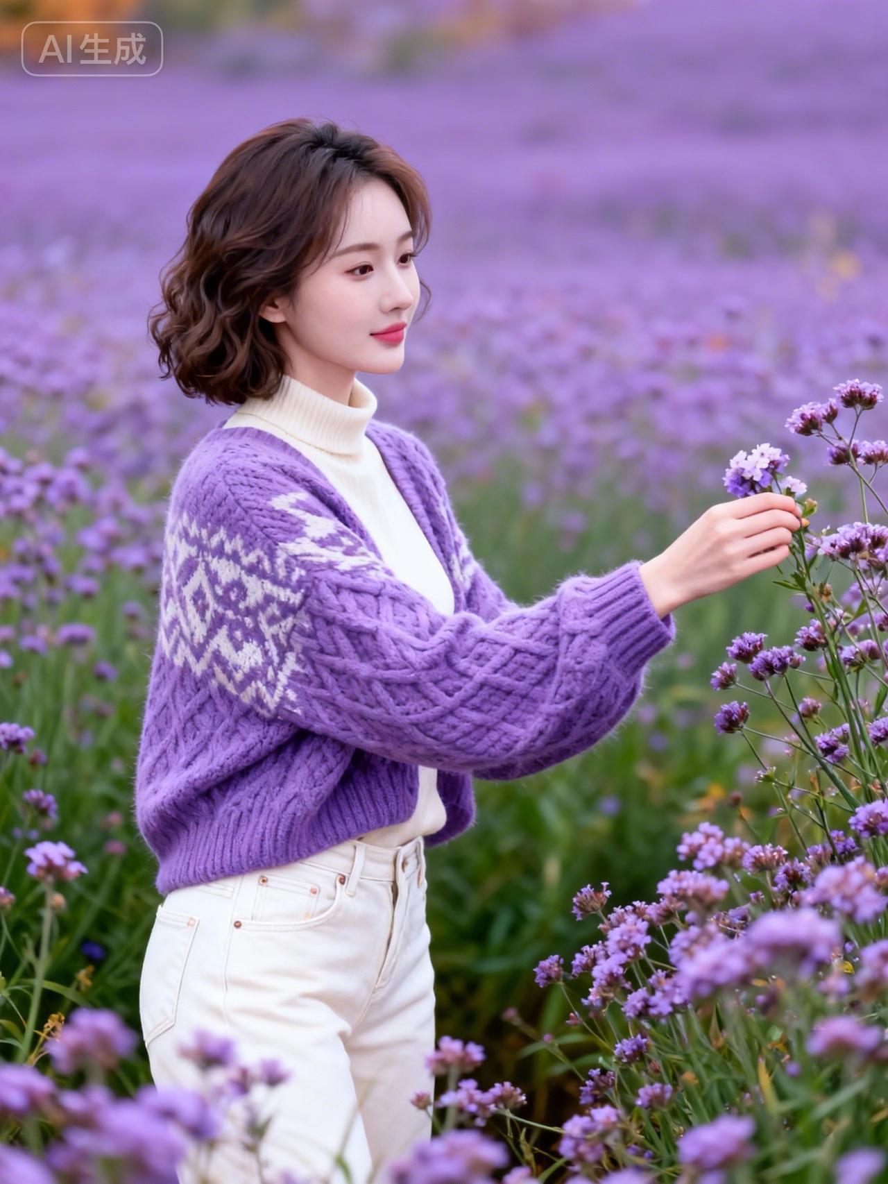 紫衣美人花间立,轻抚芳草意自闲。