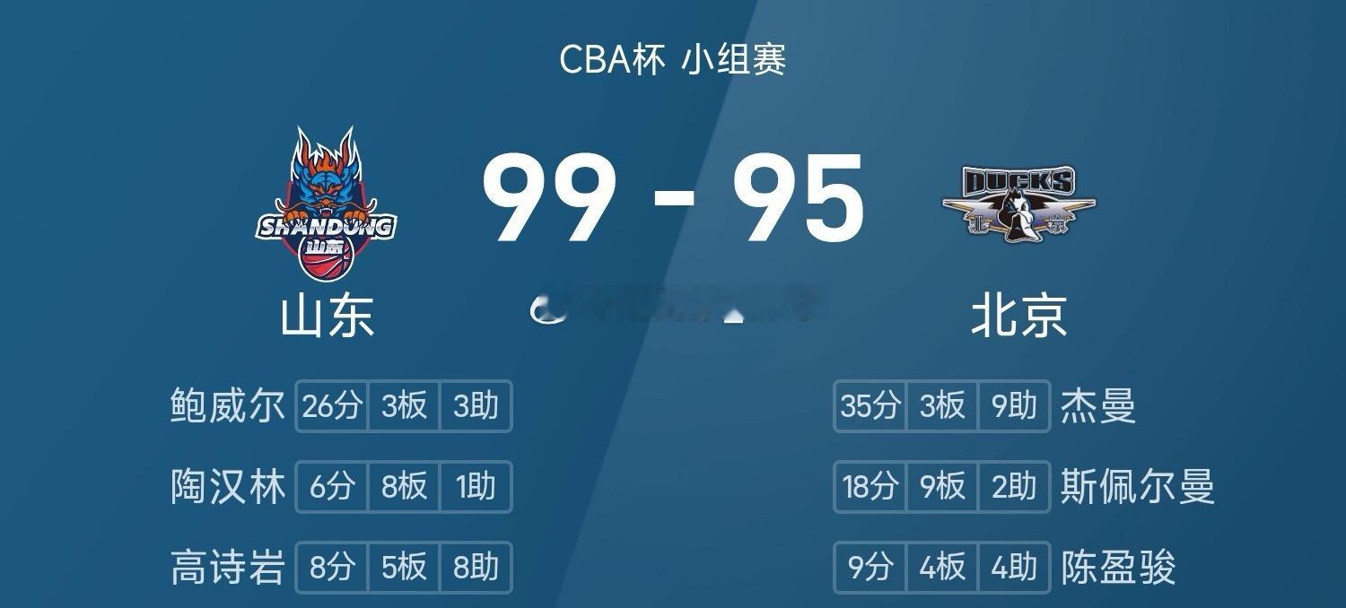 12月07日 25/26赛季CBA杯 小组赛,北京对阵山东。双方全场战罢,北京95-99不敌山东。高诗岩关键时刻命中外线三分,罚球2罚全中,北京末节反扑失败!鲍威尔得到26分3板3助率队取胜,杰曼空砍全场最高的35分3板9助。