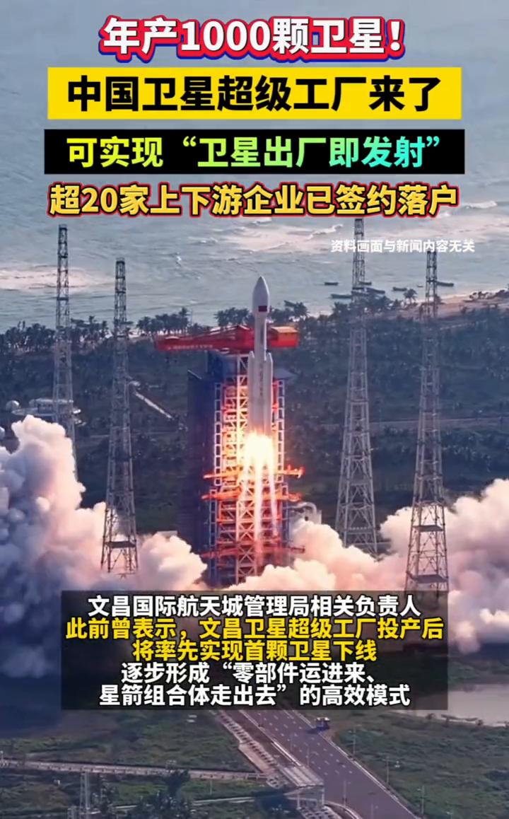 年产1000颗卫星!中国卫星超级工厂来了,可实现"卫星出厂即发射",超20家上下游企业已签约落户。 人民日报财联社。 据人民日报12月7日报道,在文昌国际航天城年产1000颗卫星的超级工厂即将投产,可实现"卫星出厂即发射"的无缝衔接。目前20余家产业链上下游企业已签约落户,火箭研发、卫星制造、发射测控的全链条生态日趋完善。 该超级工厂由国际卫星先进制造中心与国际星箭协同研发中心组成,采用"1+1+8"架构--1个超级工厂、1个试验检测中心、8个核心单机研制中心,是全国唯一可实现卫星总装与星箭合罩的生产基地,也是亚洲最大卫星制造基地。 文昌国际航天城管理局相关负责人此前曾表示,文昌卫星超级工厂投产后将率先实现首颗卫星下线,逐步形成"零部件运进来、星箭组合体走出去"的高效模式。另外,该厂将助力"千帆计划"实施,推动低轨卫星星座规模化组网。同时,依托自贸港政策优势,国际卫星数据交易服务平台将打造卫星数据保税区,吸引全球卫星数据资源汇聚。