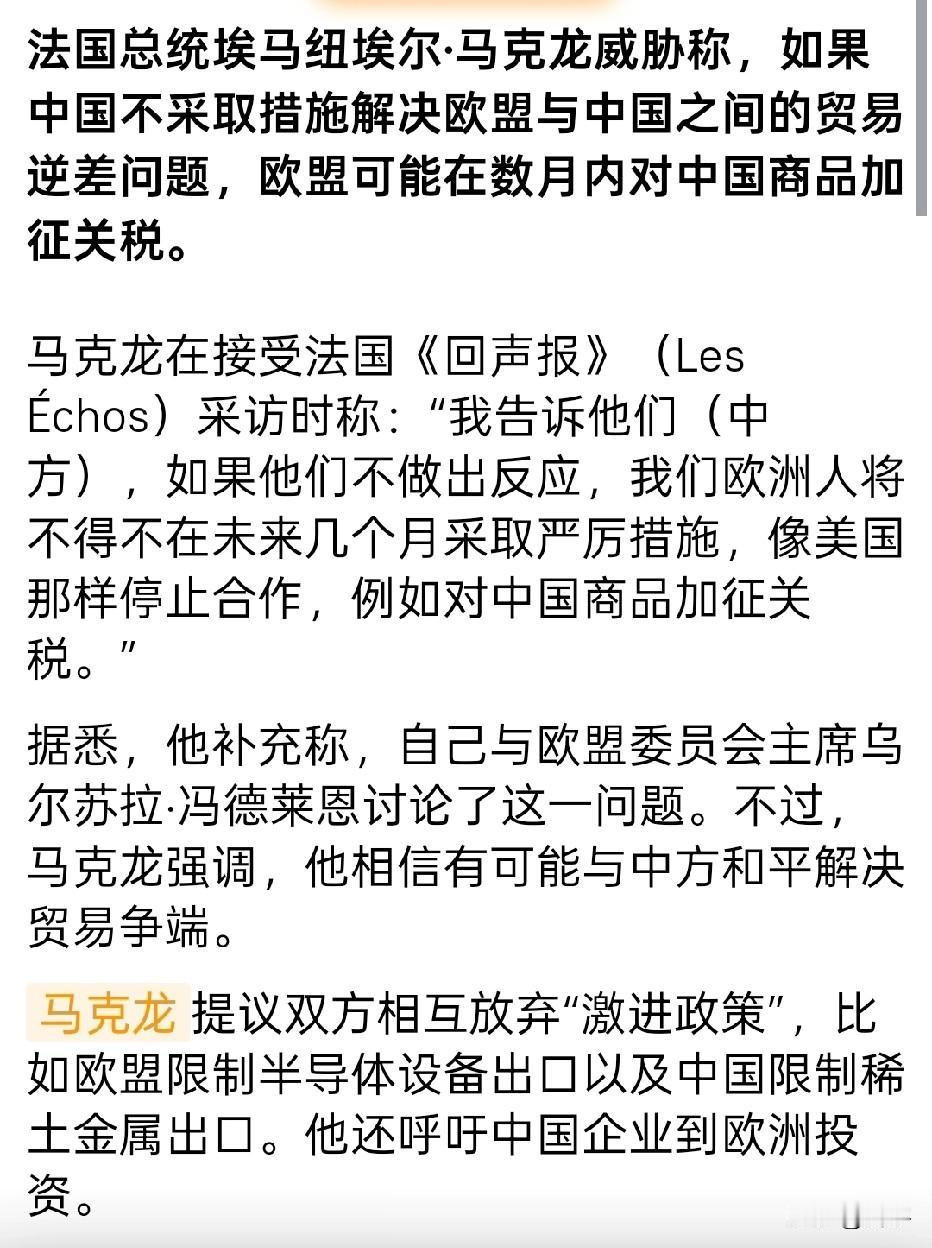 果然不出所料!马克龙翻脸了! 刚刚,国际媒体报道显示,刚刚从中国访问回到法国后的马克龙,又翻脸了,且胃口非常大,扬言要效仿美国针对中国那样! 报道显示,马克龙宣称,中欧间贸易逆差不消除,欧盟就会效仿美国,采取包括对中国商品加征关税在内的措施(具体内容见图二)。事实证明,马克龙的翻脸完全在广大网友的预料之中,早在新闻报道他出访中国之前,已有网友发声表示不能喂饱他,因为他始终要翻脸,这是大家已经从马克龙数次访华的前后变化中总结出了马克龙的行事风格,总是爱出风头,用哗众取宠的方式展现他的与众不同,以此来突出法国是独立自主的,不受任何势力影响的形象。因此,对于马克龙先生翻脸的言论不必过于纠结,因为从新闻报道来看,我们已经吸取经验教训,针对他在乎脸面,排场整得非常隆重,实际上却并没有给他多少有利可乘之机。唉!这个马克龙,在国际上上窜下跳的,活生生把自己作成了变色龙!