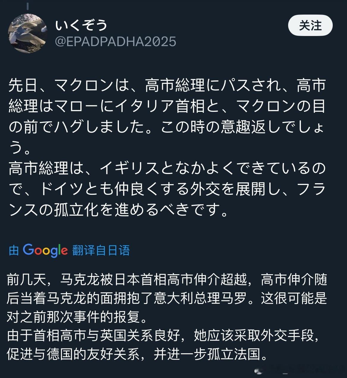 西方政客接连访华,日本网民坐不住了。理智的日本网民发文称高市早苗之流的错误言行让日本的国际处境更为艰难。当然大部分日本网民还在嘴硬,开始搞历史虚无主义。还有日本网民说高市当着马克龙的面拥抱了意大利总统,所以马克龙生气了。这个日本网民甚至建议日本和德国合作孤立法国。这脑回路真的真不理解,哪来的那么多戏