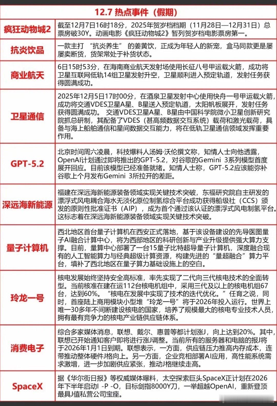 12.7周末晚间 重要财经信息汇总!1.深远海新能源2.ChatGPT-5.23.商业航天,卫星通信4.玲珑一号5.量子计算机6.消费电子7.SpaceX