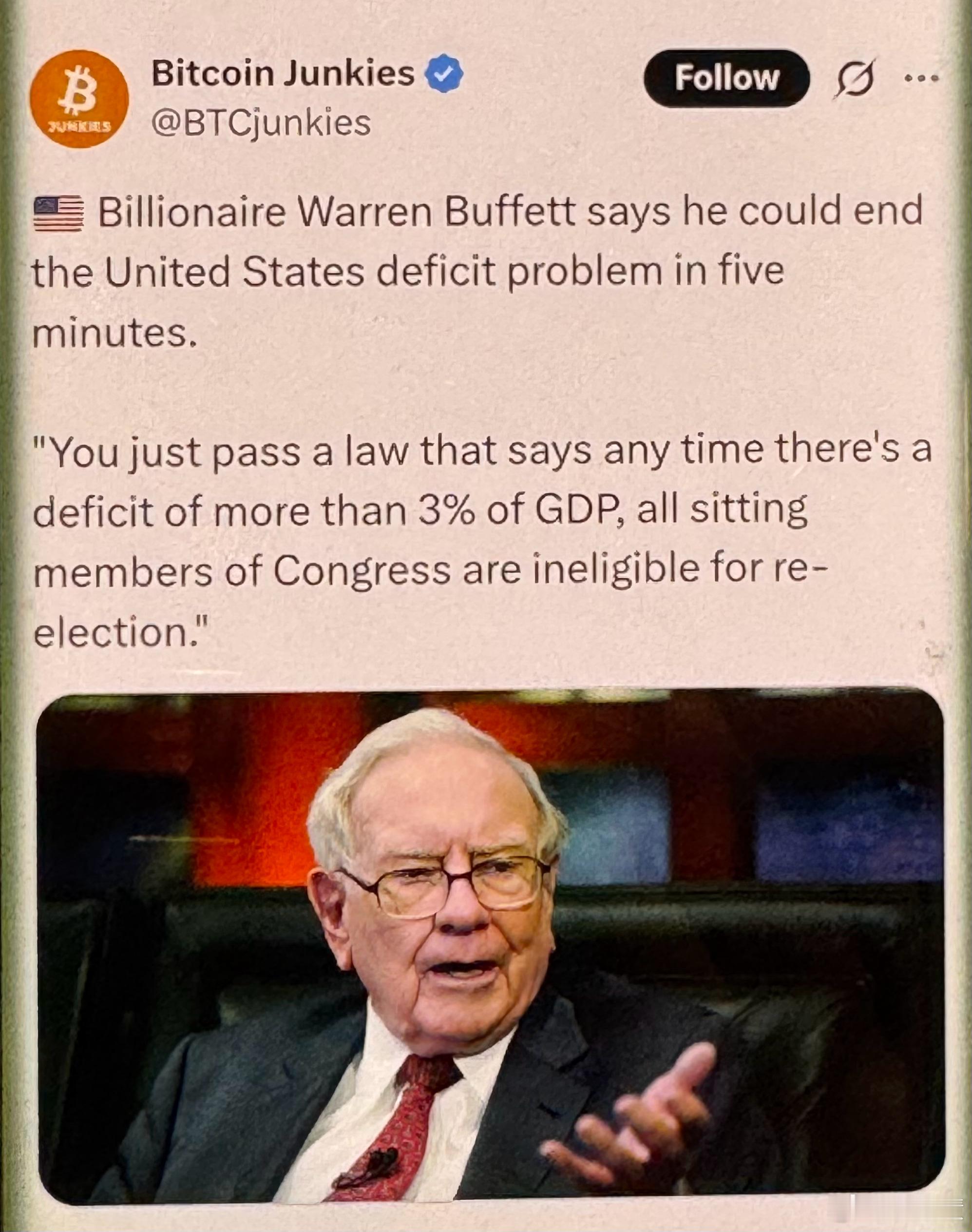 突发!巴菲特重磅发声!亿万富翁沃伦·巴菲特说,他可以在五分钟内解决美国的赤字问题。你只要通过一项法律,规定任何时候赤字超过国内生产总值的3%,所有现任国会议员都没有资格连任。