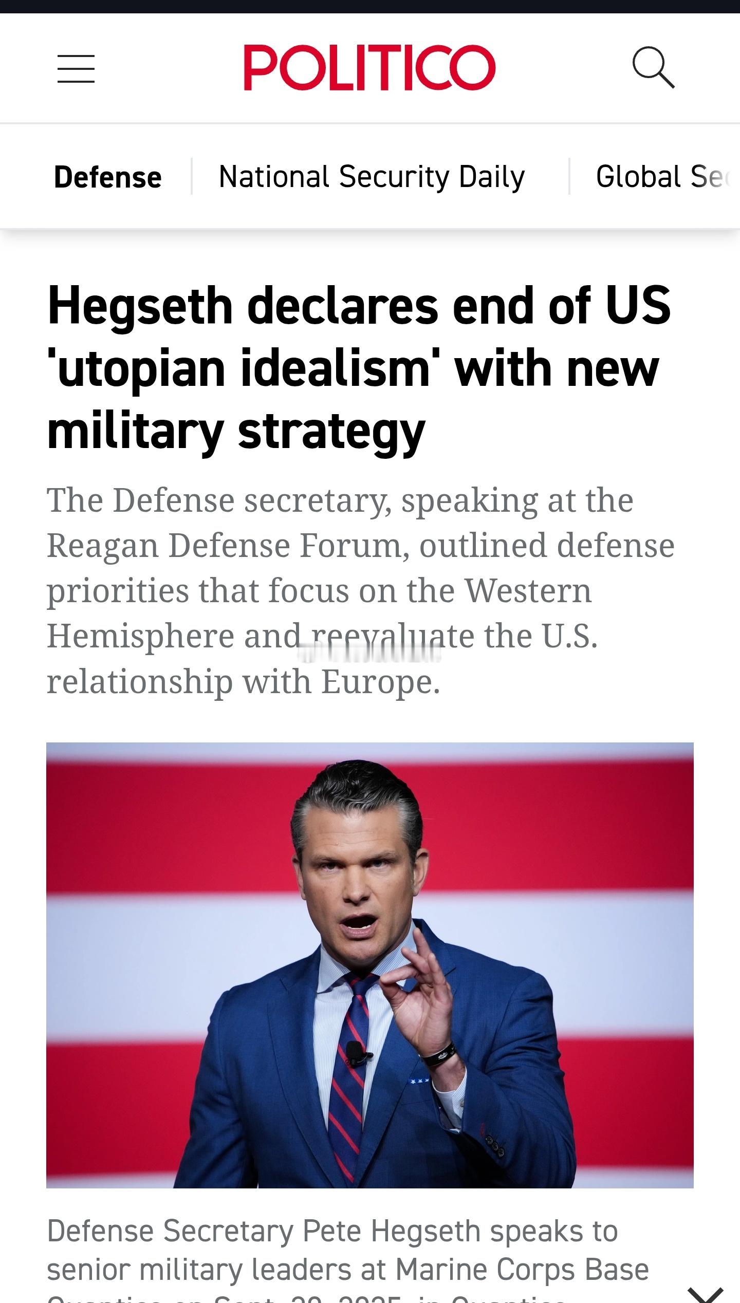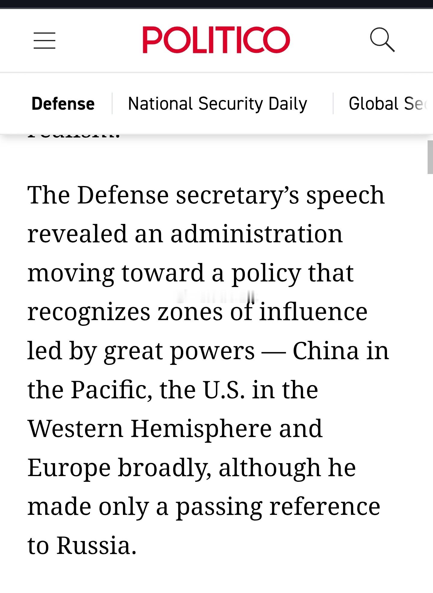 Politico对美国国防部长赫格塞斯在年度里根防务论坛上的发言评论称,特朗普政府正走向一种承认大国主导势力范围的政策,太平洋是中国的势力范围,西半球和欧洲则是美国的主导地区,他仅简略提到俄罗斯。赫格塞斯猛烈抨击冷战后美国的外交政策,点名批评历任总统和将军,并宣布美国“乌托邦式理想主义”的时代已经结束。“理想主义的乌托邦主义已经过去,”他说,“现在要转向冷峻的现实主义”。赫格塞斯表示,美国不应再被“民主输出、干预主义、不明确的战争、更替政权、气候变化、道德说教和无效的国家重建”所分心。他说,“我们将把国家务实而具体的利益放在首位”。他的讲话呼应了周四晚发布的美国新国家安全战略,也预示着五角大楼即将出台的战略文件,这份文件将明确美军的全球优先事项。