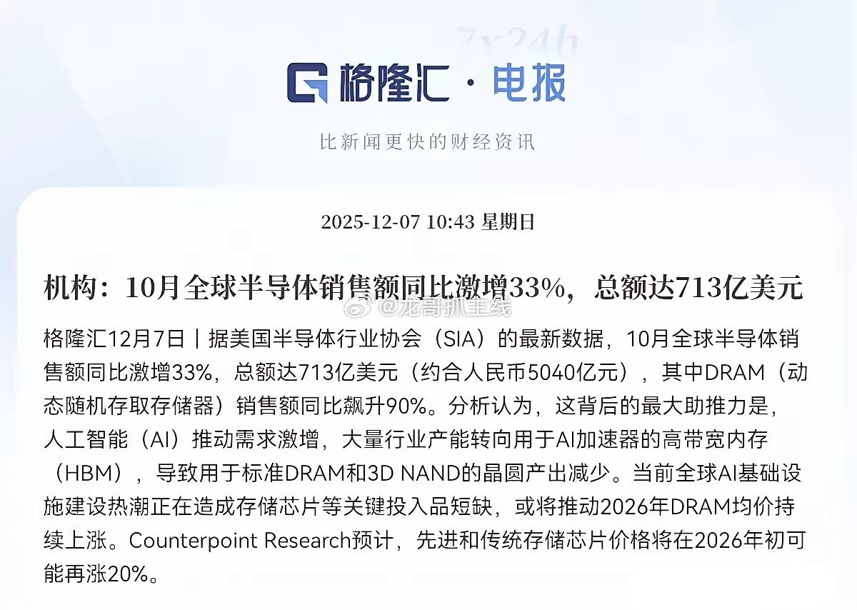 散户们坐稳扶好!利好来了,周末突发重磅利好,半导体行业传来利好消息,持股的散户要吃大肉了!上午10点多,美半导体协会数据出炉,全球10月销售额同比狂涨33%,达731亿美元,折合人民币5040亿。下周估计半导体板块又要起飞!机构明确表态,先进与传统存储芯片2026年初有望再涨20%,AI驱动下行业强势复苏,资金必定扎堆进场,相关公司潜力十足。明日半导体板块大概率全面反攻、集体爆发,这波行情别错过,吃肉机会就在眼前!最后,你觉得这波半导体利好,会高开回落,还是低开高走呢?