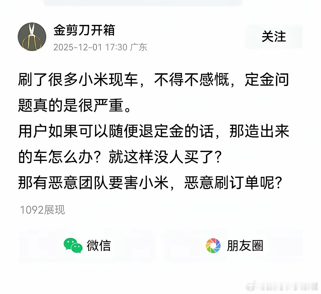 说的好像就小米一家卖车似的。这么多家卖车的就你这里黑订金。