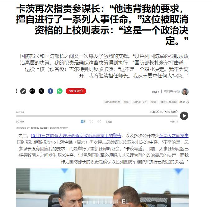 以色列国防部长卡茨与国防军总参谋长扎米尔就人事任免权的争论仍在持续,现在扎米尔拉上了一些被卡茨暂停晋升的军官一起攻击卡茨。