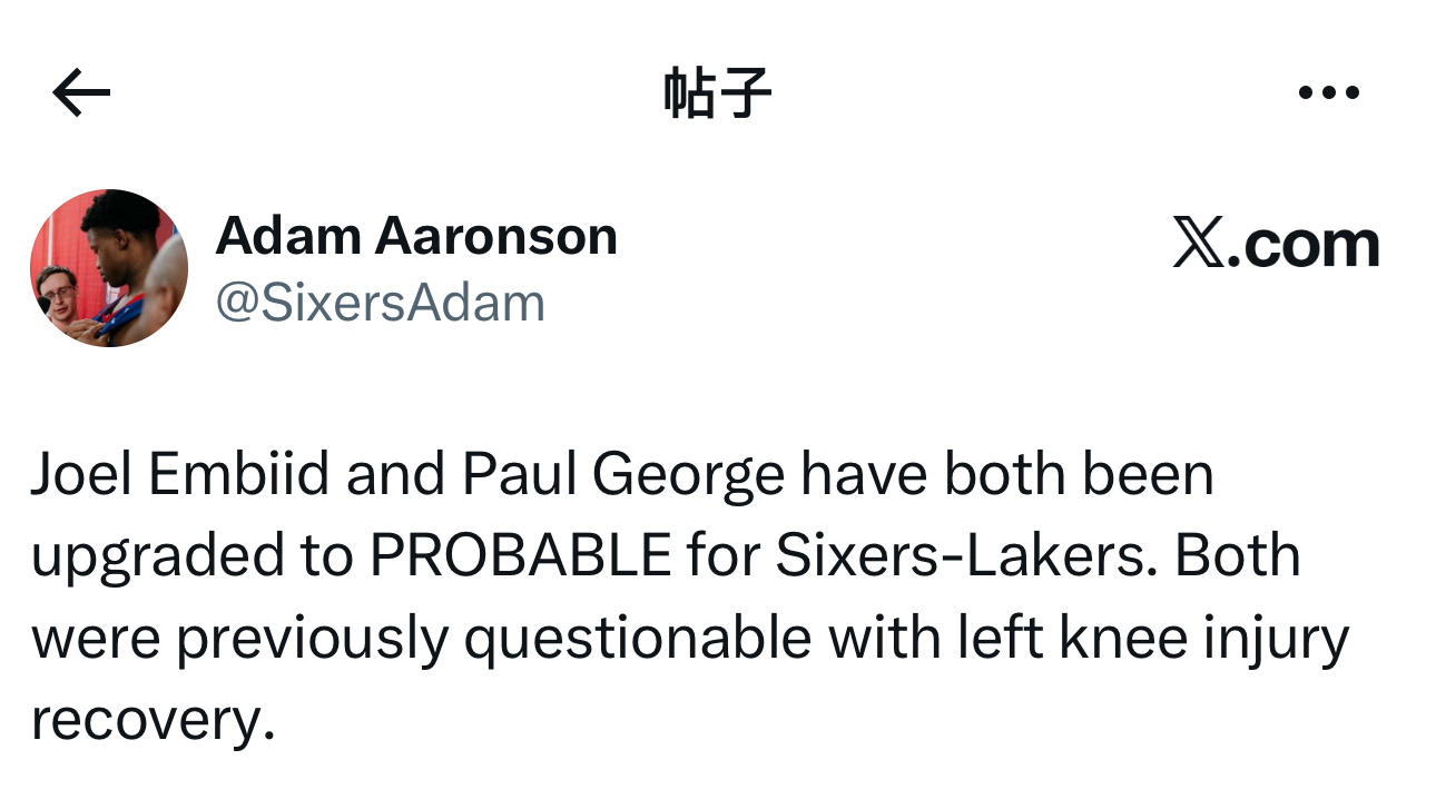 伤病报告更新:乔尔·恩比德和保罗·乔治的状态均已升级为“可能出战”(PROBABLE 75%概率),他们将会参加76人对阵湖人的比赛。此前两人均因左膝伤势恢复情况而被列为出战成疑。费城76人新赛季篮不住PaulGeorge保罗乔治