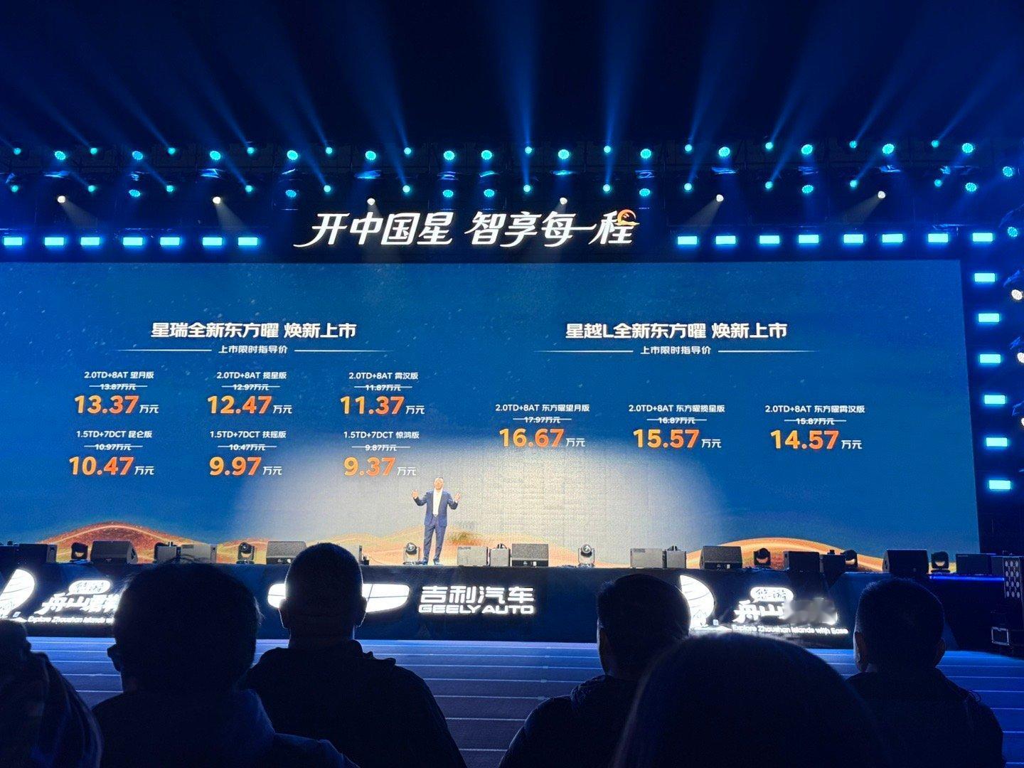 开中国星智享每一程·美在舟山今天除了音乐节,还有星瑞和星越L全新东方曜版本的上市限时指导价如下:星瑞全新东方曜• 2.0TD+8AT 星宇版:13.37万元• 2.0TD+8AT 星玺版:12.47万元• 2.0TD+8AT 青冥版:11.37万元• 1.5TD+7DCT 昆仑版:10.47万元• 1.5TD+7DCT 钛越版:9.97万元• 1.5TD+7DCT 惊鸿版:9.37万元星越L全新东方曜• 2.0TD+8AT 东方曜星月版:16.67万元• 2.0TD+8AT 东方曜星辰版:15.57万元• 2.0TD+8AT 东方曜青冥版:14.57万元心动就行动起来,我9号也要试驾,可以等我的视频