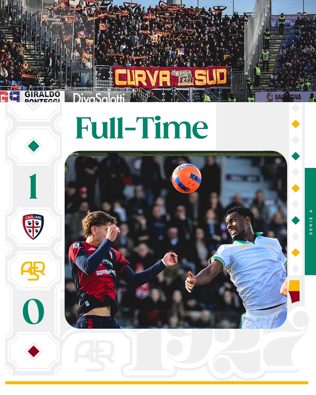 意甲联赛 罗马客场0:1输给了卡利亚里队。