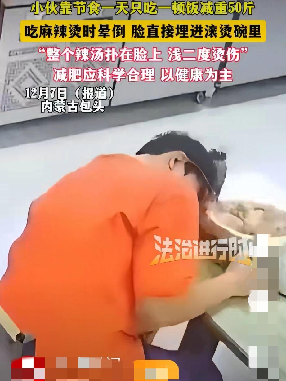 节食减重,包头小伙吃麻辣烫竟遭"毁容"! 为瘦50斤狠饿自己,一天只吃一顿饭,最终却在麻辣烫店晕倒、脸埋滚烫辣汤——12月7日内蒙古包头这则新闻,让无数网友唏嘘不已。 20多岁的小伙一直被体重困扰,为了快速瘦身,他选择了最极端的节食方式:放弃正常三餐,每天仅靠一顿饭维持体能。凭着惊人的毅力,他确实减掉了50斤,正当以为即将收获理想身材时,意外却突然降临。 事发当天,小伙因过度饥饿走进一家麻辣烫店,刚坐下没多久,就因长期营养不良、血糖过低眼前一黑,直直向前倒去,脸瞬间埋进盛满滚烫辣汤的碗里。店员和顾客见状急忙施救,将他送往医院后,诊断结果为浅二度烫伤,脸部、颈部都留下了明显的烫伤痕迹。原本追求的"变美",反倒变成了难以挽回的伤害。 减肥的初衷是为了健康与美好,但极端节食从来都是"得不偿失"。身体的代谢需要充足能量支撑,长期饥饿不仅会导致营养不良、免疫力下降,还可能引发低血糖、胃病等一系列健康问题,甚至像这位小伙一样遭遇意外。 真正的瘦身,从来不是"饿出来的",而是饮食均衡与适度运动的结合。与其追求速成而透支健康,不如循序渐进地调整生活方式。毕竟,没有健康作为底色,再完美的身材也失去了意义。你是否也尝试过不合理的减肥方法?