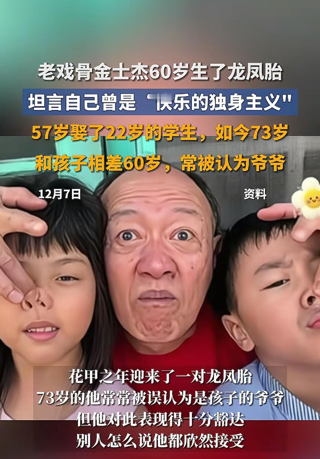 老戏骨金士杰60岁生了龙凤胎,坦言自己曾是"快乐的独身主义",57岁娶了22岁的学生,如今73岁,和孩子相差60岁,常被认为爷爷