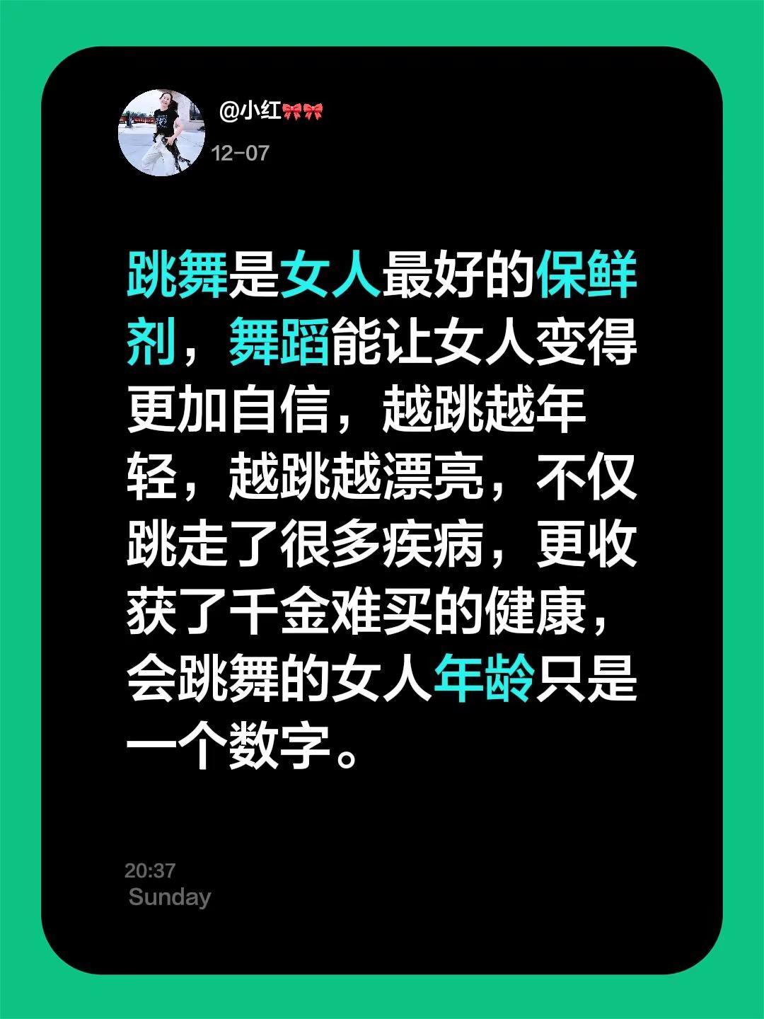 跳舞是女人最好的保鲜剂,舞蹈能让女人变得更加自信,越跳越年轻,越跳越漂亮,不仅跳走了很多疾病,更收获了千金难买的健康,会跳舞的女人年龄只是一个数字。越跳越健康