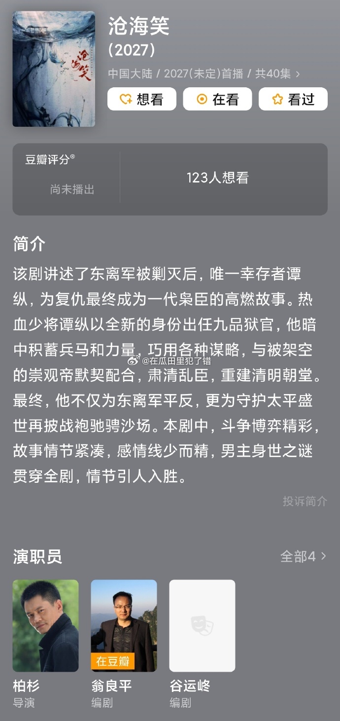 瓜主爆料田栩宁、成毅有望合作新剧《沧海笑》,预计明年年初开机……上一个被撕掉的是