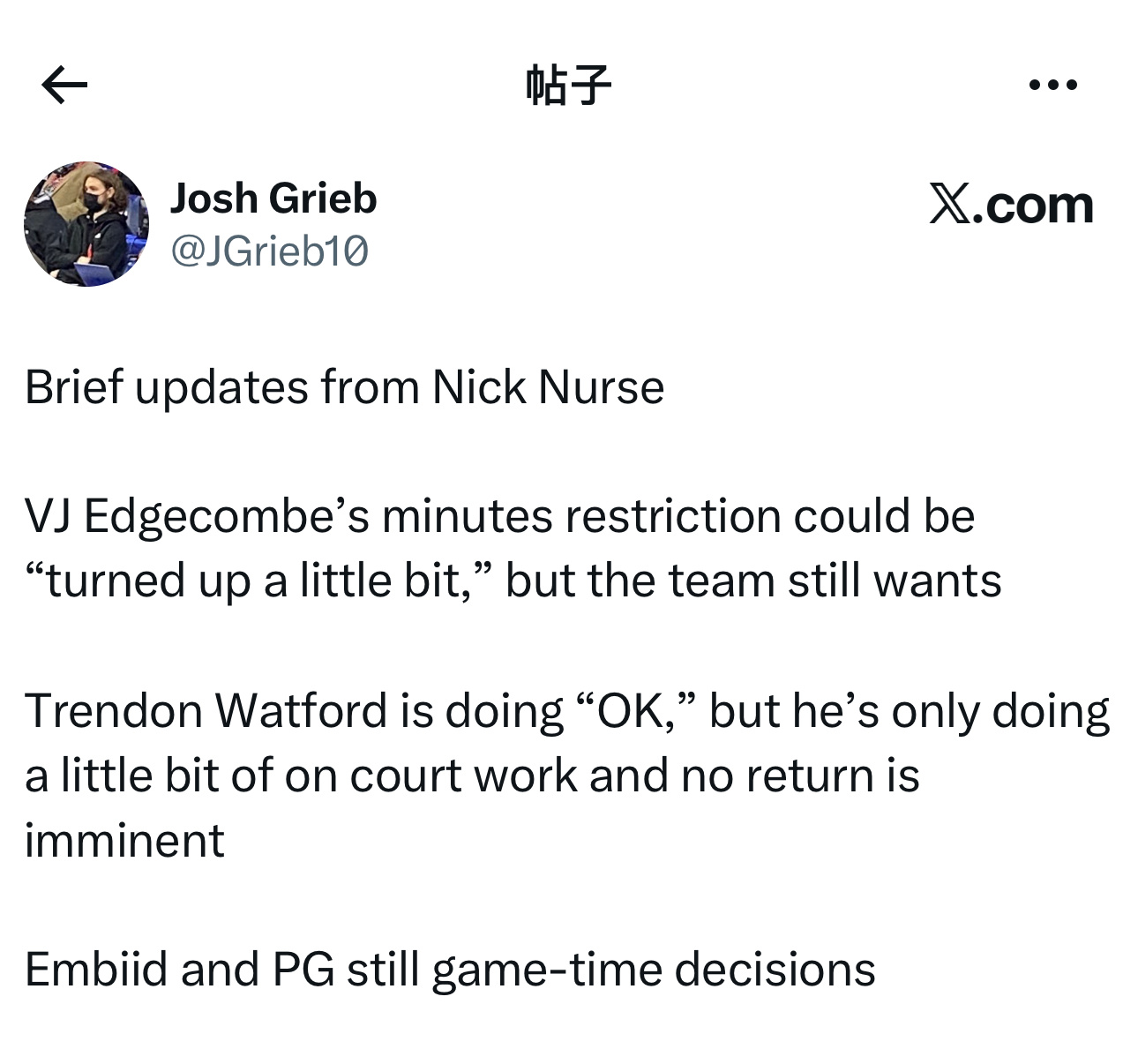 主教练尼克·纳斯赛前采访释放的信息:VJ·埃奇库姆的上场时间限制可能会“略微放宽”,但球队仍希望保持谨慎。特伦登·沃特福德恢复情况“尚可”,目前仅进行少量球场训练,暂无明确复出时间表。乔尔·恩比德与保罗·乔治今日比赛是否出战仍将视赛前情况决定。费城76人新赛季篮不住76人vs湖人