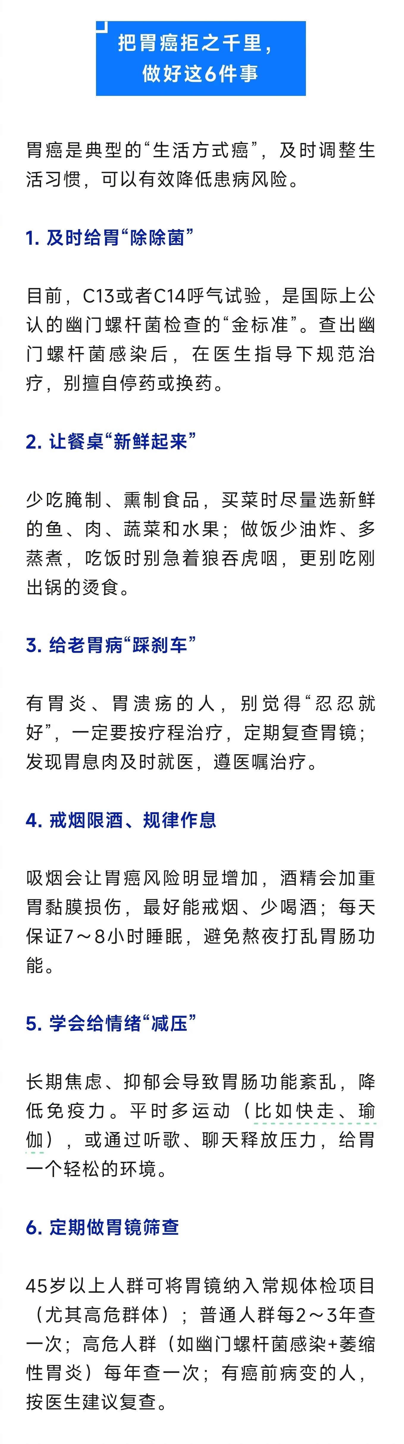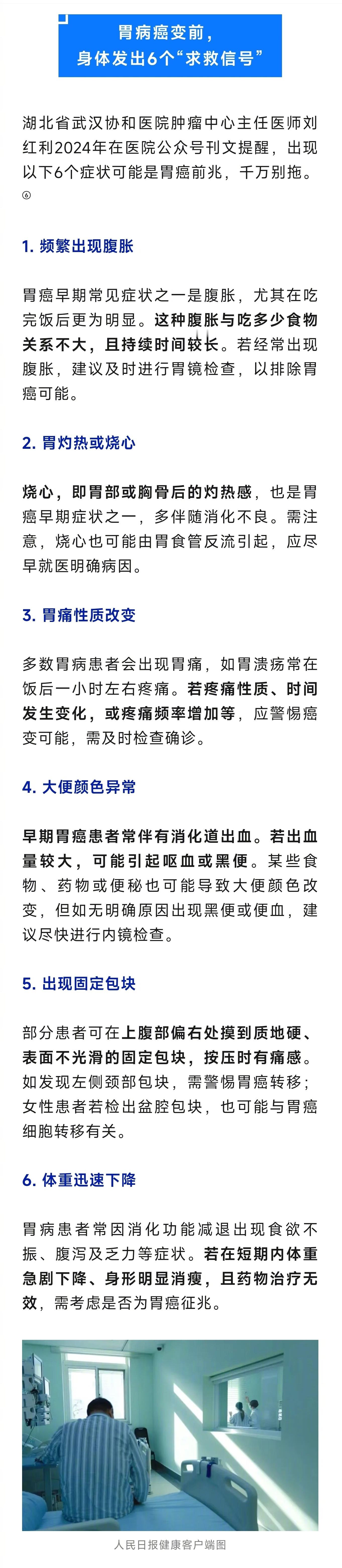 别把这些胃病拖成癌【别把这6种胃病拖成癌】很多胃癌是一口一口吃出来的 胃病不是小事,拖久了真的会“癌变”。这六类胃病如果长期不治或反复发作,很可能一步步走向癌症,可以说是胃癌的“前身”。⚠️胃溃疡:胃黏膜在反复修复过程中,若炎症持续存在或修复机制异常,可能导致细胞增殖紊乱,进而发展为不典型增生,最终癌变。⚠️胃食管反流:长期反流不仅损伤食管黏膜,还可能通过反流物影响胃近端黏膜,间接增加局部癌变风险。⚠️萎缩性胃炎:慢性萎缩性胃炎被视为胃癌的“高危土壤”。其演变为胃癌通常遵循以下过程:慢性胃炎→萎缩→肠化生→异型增生→胃癌。⚠️部分胃息肉:要高度警惕的类型是腺瘤性息肉,它是公认的“胃癌的预备队员”。⚠️上皮内瘤变:上皮内瘤变也被称为异型增生或不典型增生,是细胞开始“变坏”的阶段。⚠️幽门螺杆菌感染:幽门螺杆菌感染是胃癌的重要危险因素之一。(人民日报健康客户端)