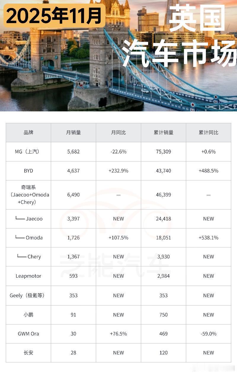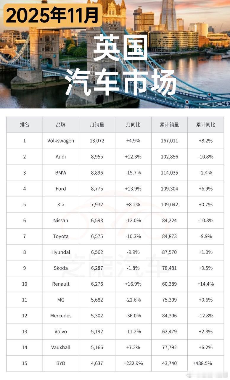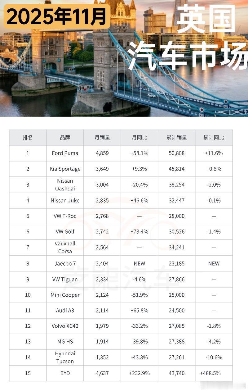 11 月英国车市销量同比微降,电动化增速放缓,电动车同比增幅跌至近两年低点,插混增长相对亮眼,柴油车份额持续萎缩,消费者对电车的成本和充电顾虑有所回升。传统品牌中大众仍居榜首,雷诺同比增长重返前十;中国品牌表现突出,比亚迪销量同比激增超两倍,奇瑞系销量破一定规模,杰酷 7 连续四月跻身车型前十,零跑、极氪也实现销量突破,SUV 成为中国品牌破局核心