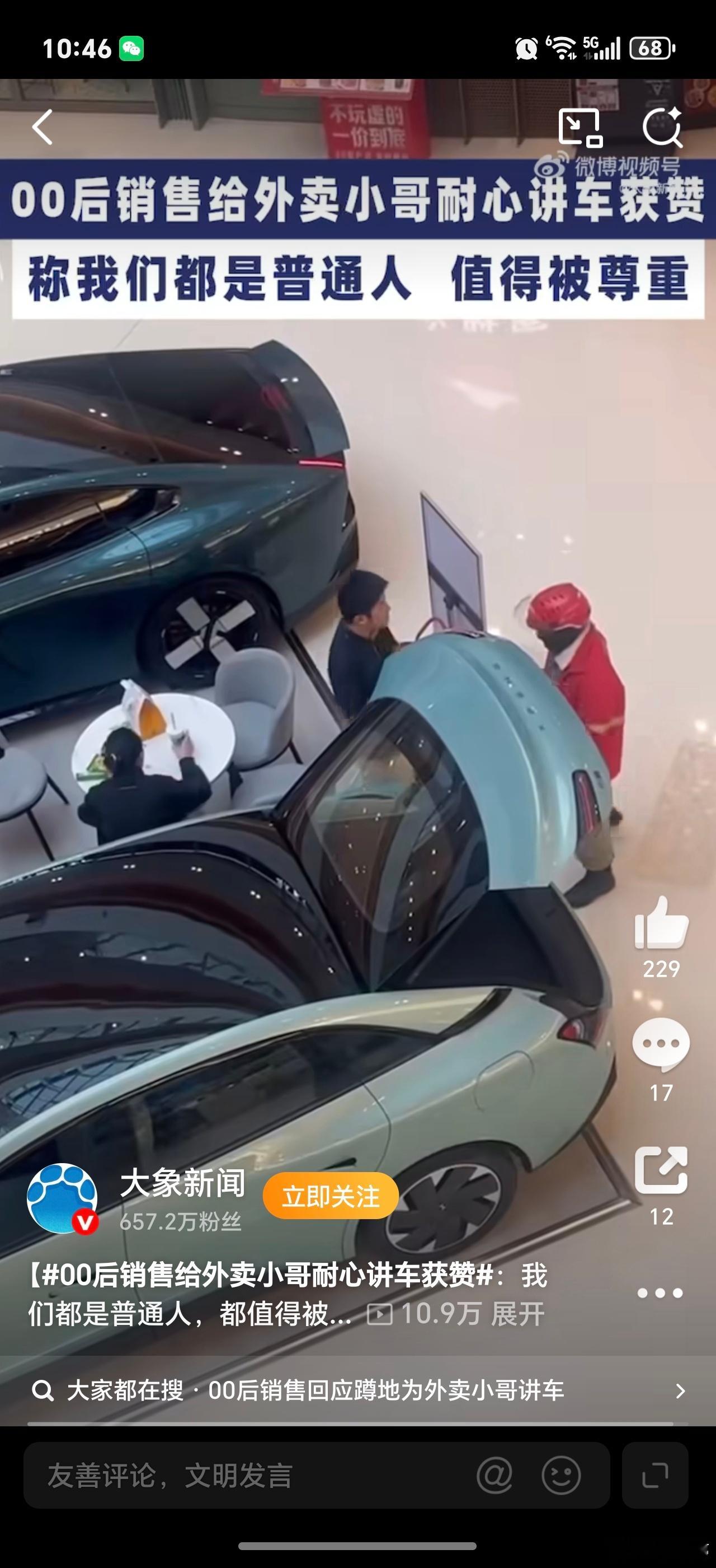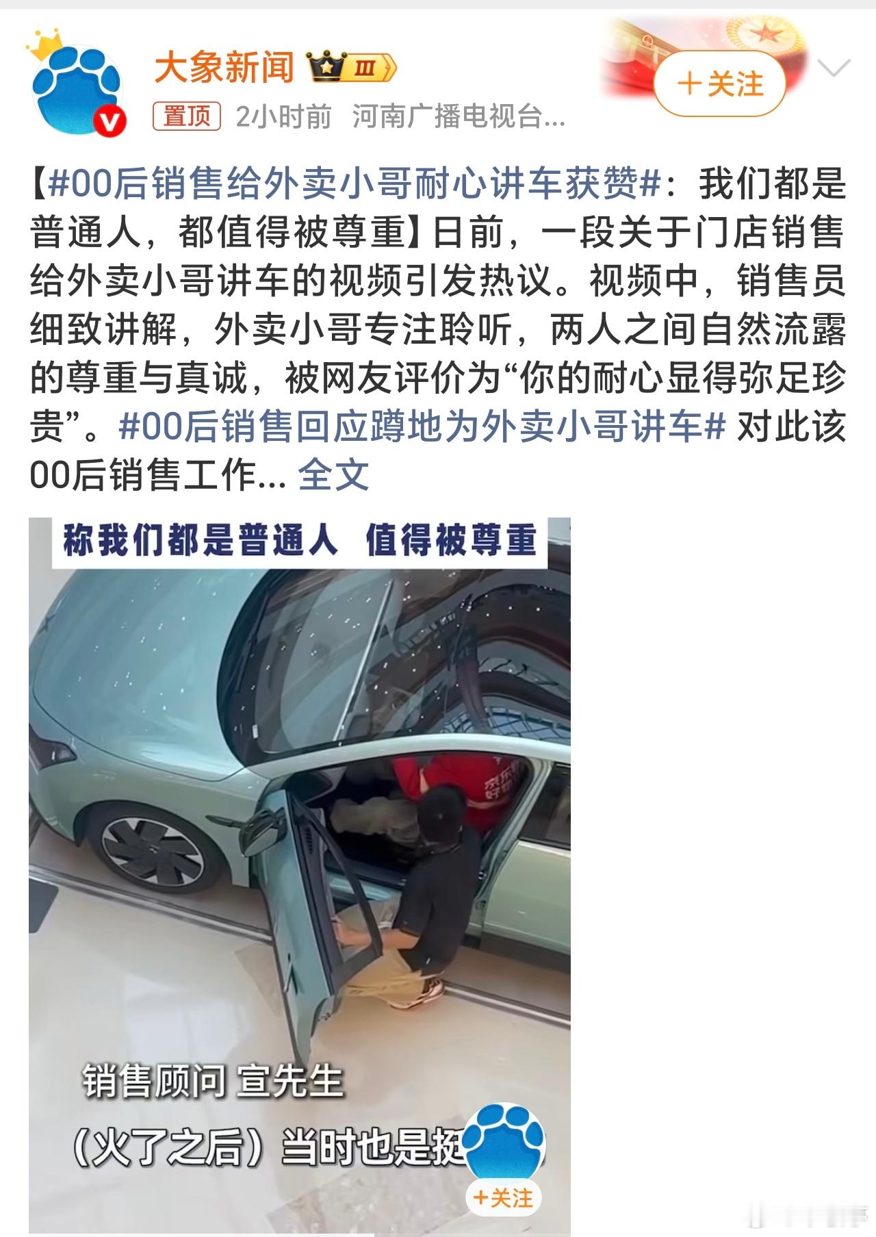00后销售给外卖小哥耐心讲车获赞我们都是普通人,都值得尊重!看了一下是小鹏门店,现在新能源品牌的年轻销售人员服务意识确实非常强,值得传统汽车品牌学习。