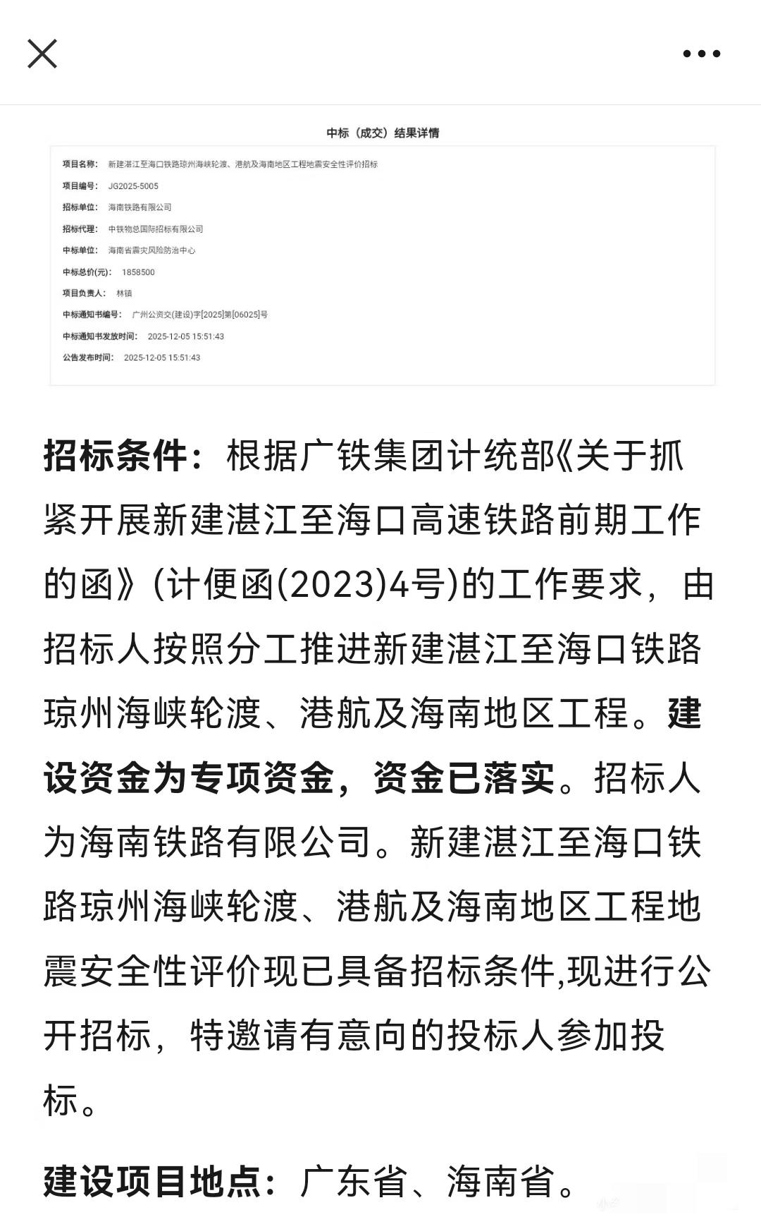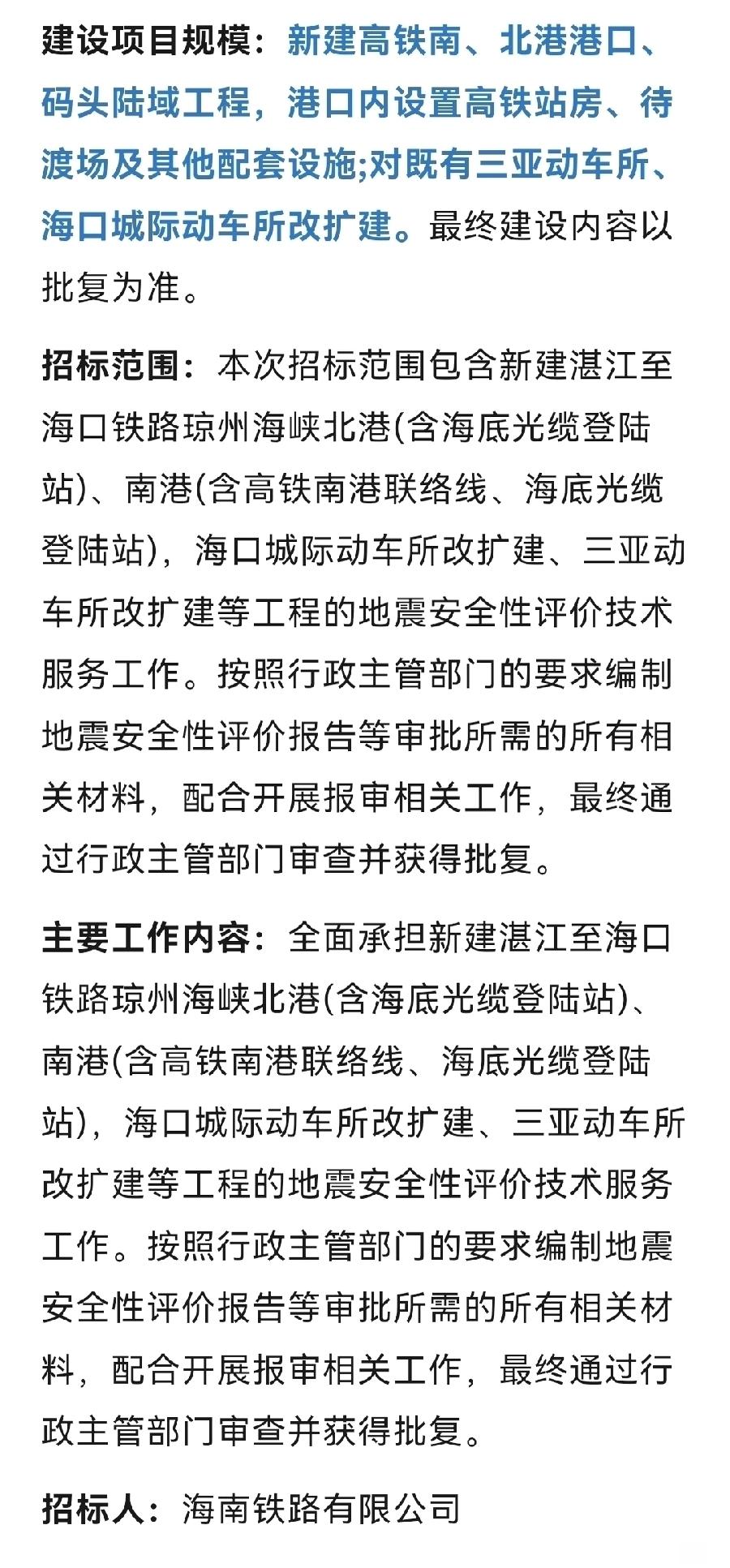 新建湛海高铁南、北港港口、码头陆域工程,及高铁站房,湛江至海口高铁工程中标结果!!! 最近新建湛海高铁南、北港港口、码头陆域工程,及高铁站房,湛江至海口高铁工程中标结果备受关注。与此同时,新建合浦至湛江铁路也有新动态。这个项目建设地点在广东省湛江市,线路从合浦站引出,向东经多个镇引入湛江西站,新建正线长约141.7公里,设站6座,还同步建设北海联络线等约33.3公里。工程涵盖正线和联络线工程,像合湛铁路广东段新建正线全长就达76.644km。广湛江高铁 湛江北站联络线 合湛高铁招标 湛江铁路建设 玉湛高铁 广深广湛海高铁 湛江高铁降价