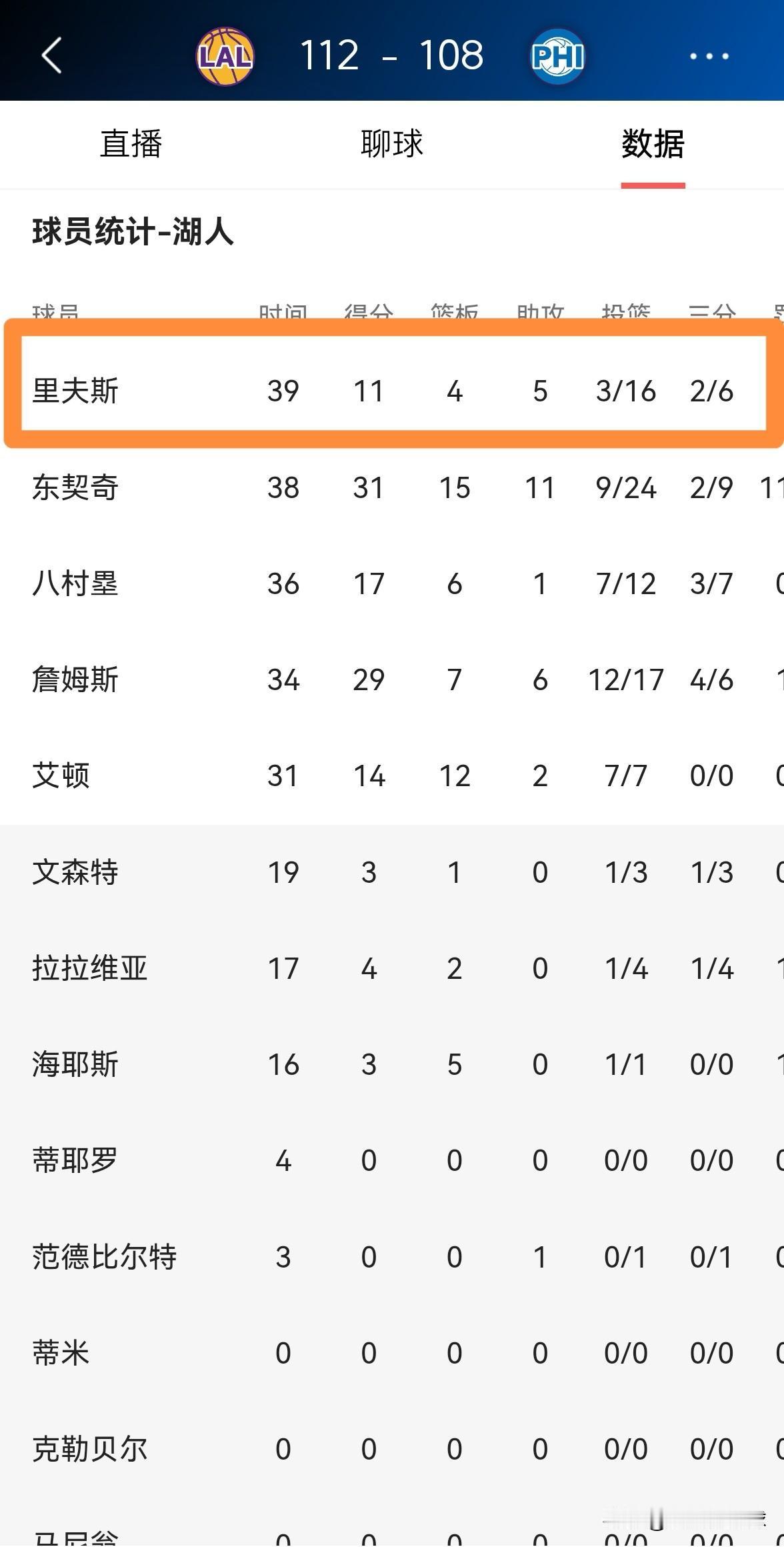 湖人三当家里弗斯真是太黯然失色了!虽然今天湖人在客场以112:108战胜76人,但是里弗斯的表现却是极其暗淡。 全场比赛下来,里弗斯首发出战39分钟,投篮16中3,其中三分球6中2、罚球5中3极其低效的得到11分,他的场上正负值为+1。 毫不客气的说,以里弗斯在本场比赛中的表现来看,他完全不配当湖人的三当家。