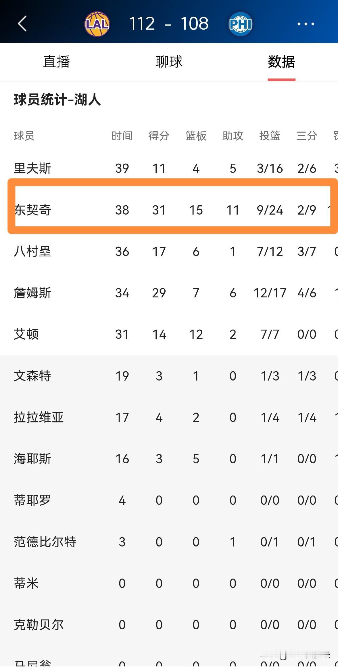湖人当家球星东契奇真是太闪耀了!在今天湖人客场以112:108击败76人的比赛中,东契奇在攻防两端都打出了无可挑剔的表现。 全场比赛下来,东契奇首发出战38分钟,投篮24中9,其中三分球9中2、罚球14中11爆砍31分15篮板11助攻2盖帽,他的场上正负值为+12。 虽然此役詹姆斯在第四节比赛中发挥出色,但是从全场比赛来看,东契奇才是场上最闪耀的球员。