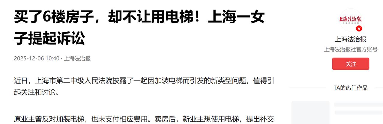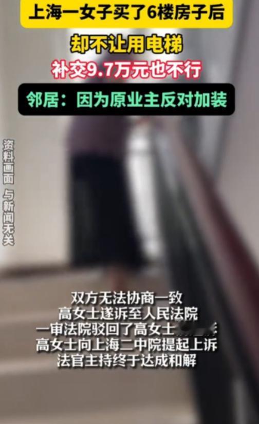 上海,一位女子出于孝心,给腿脚不便的父母买了套6楼房子。住进去后,父母想用电梯却被邻居拒绝。原来这楼是加装电梯,原房主当初拒不分摊费用,按协议不能使用。女子为让父母用电梯,主动提出分摊97000元装电梯费用,可邻居仍不同意,称时过境迁,女子得多掏钱。女子觉得原房主过错不该自己承担,便将邻居告上法院,要求确认使用电梯权利。 为了让腿脚不便的年迈父母能安享晚年,上海的高女士在二手房市场里千挑万选,最终锁定了一套六楼的房子,这套房最大的卖点,就是老楼已经加装了电梯,不用再让父母为爬楼梯犯难。 本以为这是尽孝的完美方案,可没料到父母搬进去的第一天,那扇本该带来便利的电梯门,就成了一家人跨不过去的 “心门”,父母想坐电梯,直接被邻居拦了下来。 这事儿的根源要追溯到这栋楼加装电梯时的历史遗留问题,原来这栋楼的电梯是后期统一加装的,当初邻里间早有约定,谁出钱谁才能享受电梯使用权。 在邻居们凑钱筹备安装的阶段,高女士这套房子的原业主,是个出了名的 “硬骨头”,任凭邻居们磨破嘴皮上门劝说,这位老先生都咬定自己身体硬朗,还抛出 “我就爱爬楼锻炼身体” 的理由,坚决不肯分摊一分钱的安装费。 邻居们实在没辙,只能在单元内定下一个特殊条款,凡是当初没出钱的住户,一律不能使用电梯,这本是针对原房主的约定,却在高女士毫不知情的情况下,成了她接盘这套房子后突然引爆的 “烂账”。 作为新房主高女士觉得自己特别冤枉,她买房就是奔着电梯来尽孝,压根没想过要占邻居的便宜,得知电梯使用权的前因后果后,她当即拿出了十足的诚意,主动提出要把当年原业主没掏的 97000 元安装费全额补上。 按常理说有人愿意补钱入伙,对邻居们来说是好事,可大家的态度却异常坚决,不仅一口拒绝了这笔补缴的费用,还直言不管房产证上的名字换没换,这户人家就是没资格用电梯。 在老邻居们眼里,这早已不是一笔简单的 97000 元的账,而是一笔算不清的 “感情债” 和 “损失费”,当年就因为原房主这一户的死磕,整个电梯加装工程被无限期拖延,邻居们不仅为了协调这事跑断了腿,还垫付了不少额外的误工费,更关键的是因为错过了政策时间窗口,原本能拿到的政府加装电梯补贴也打了水漂。 在他们看来现在的 9 万 7 早就覆盖不了当年的实际损失,要是让高女士按原价 “上车”,等于让他们为前任房主的固执买单,这实在太不公平,所以坚持要求高女士得多掏一笔钱来弥补当年的损失。 一边是满腹委屈的新业主,明明愿意花钱买便利,却被拒之门外,还觉得原房主的过错不该由自己承担,一边是憋了一肚子火的老住户,认为自家当年的付出和损失不能被一笔勾销,双方的僵持很快陷入了死局,无奈之下高女士只能一纸诉状将邻居们告上法庭,要求法院明确自己一家人使用电梯的合法权利。 法庭上的争议焦点很明确,上一任房主留下的恩怨,到底该不该由现任房主来买单?从法律层面来看,这事的逻辑其实很清晰,依照《民法典》的相关规定,房子完成过户后,作为建筑物附属设施的电梯使用权,会随着房屋产权的转移而自然更替。 当初原房主和邻居们签署的 “拒付禁用” 协议,只对签订协议的当事人,也就是那位爱爬楼的老先生有约束力,没法像一道封印一样,一直锁着这套房子的电梯使用权,只要高女士愿意履行出资义务,她就理应享有电梯这个共用设施带来的便利。 虽然法理上站在了高女士这边,但法官也没打算生搬硬套法条,毕竟老小区里邻里之间低头不见抬头见,解开心结远比一纸冰冷的判决书更重要,原房主当年的行为确实给邻居们造成了客观损失,完全无视他们的付出也不合情理。 经过法庭多轮调解,一个兼顾法理与人情的方案终于敲定,邻居们不再阻拦高女士一家使用电梯,高女士除了补缴那 97000 元的基础安装费外,也同意在合理范围内额外支付一笔补偿款,用来弥补当年因工程延误给邻居们造成的损失,这笔困在六楼电梯井里的陈年旧账,总算是连本带利算清了,高女士的父母也终于能安心坐上电梯,安享晚年。 (信息来源:上海法治报——买了6楼房子,却不让用电梯!上海一女子提起诉讼)