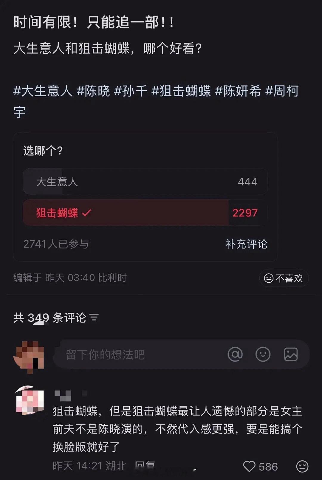 陈妍希的《狙击蝴蝶》热度反超陈晓的《大生意人》了吗?狙击蝴蝶热度