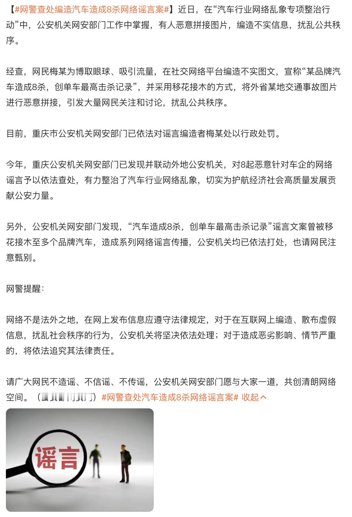 互联网不是法外之地,有些人整天真的闲得发慌么。网警查处编造汽车造成8杀网络谣言案,造谣博眼球最终害自己,何苦呢。网警查处编造汽车造成8杀网络谣言案