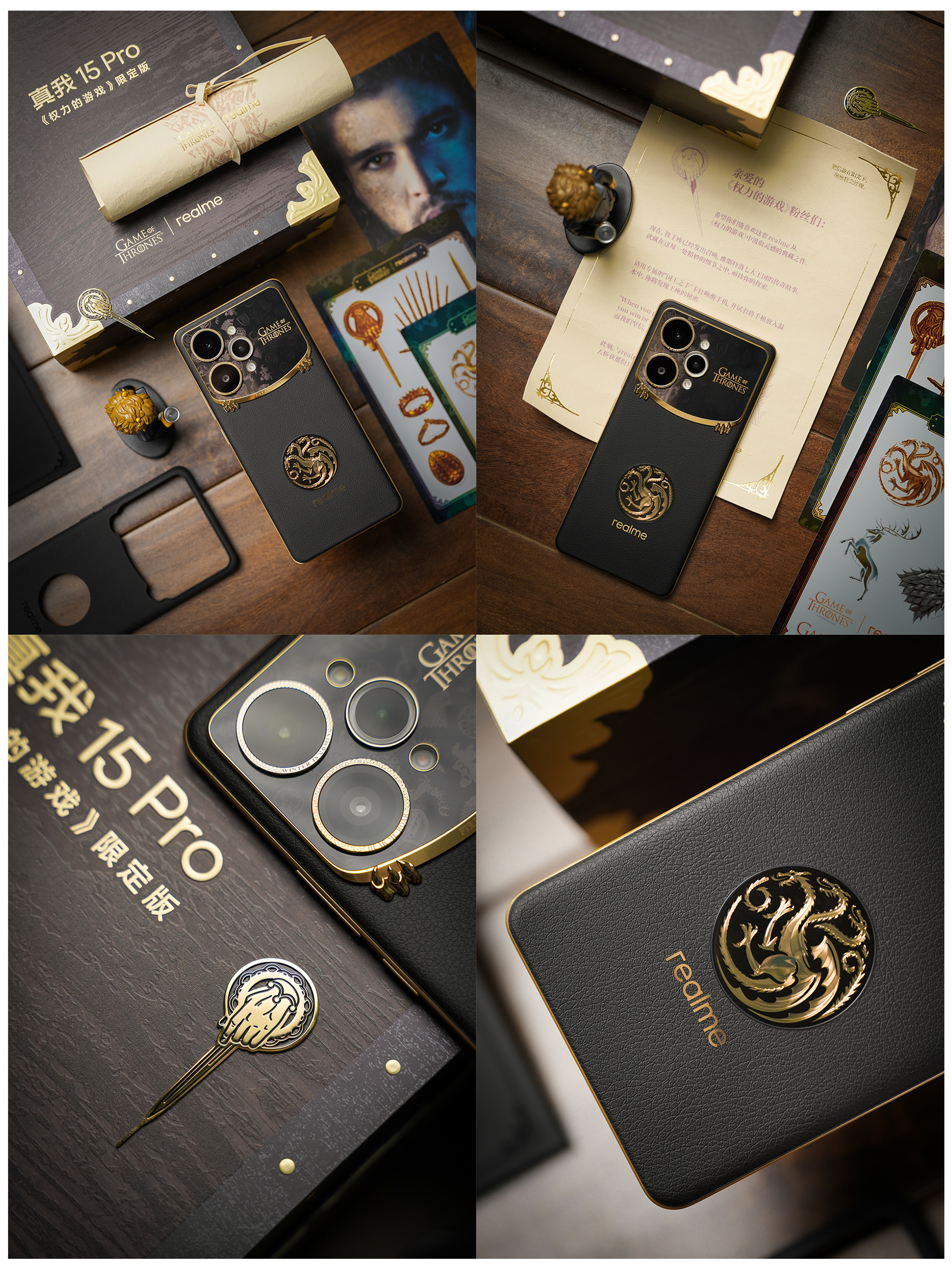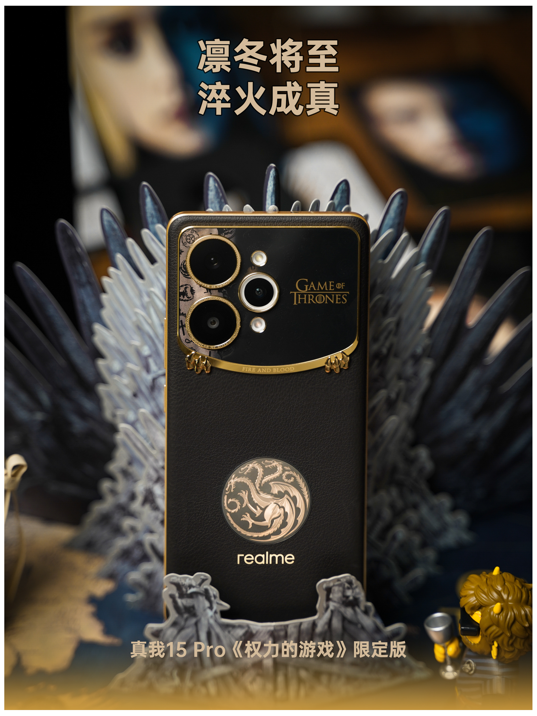 凛冬将至,淬火成真:真我15 Pro《权力的游戏》限定版不得不说,阿真现在在联名产品上面,真的也是非常用心的“越级”。全新的真我15 Pro《权力的游戏》限定版,又是一套典藏级的产品。用科技的力量,让经典的权游美学有着别样的呈现。从包装的龙蛋木盒,到开箱的铁王座,到定制卡针、手机壳、无字信纸、明信片和贴纸,再到手机上的鎏金龙刻、群雄纹章、龙焰玄革后盖、独特纹理点缀的镜头环,还有深度定制的UI,开机动画、充电动效、GT模式、专属滤镜和水印等,处处是细节,处处是惊喜,处处求极致。同时在龙焰玄革的后盖上,还有着热感变色的新科技。可变色并且还是皮革的后盖,着实是第一次见。在黑色或者红色之间,加上金色的点缀,呈现出不一样的视觉盛宴。即便作为手机单体,大电池、强性能、超清影像、AI能力等,也有着出色的表现。科技与传奇,这一套将带来的不仅仅是一部有个性的手机,更是一场视觉的享受,情绪价值的大满足。这便是,真我15 Pro《权力的游戏》限定版,值得拥有!