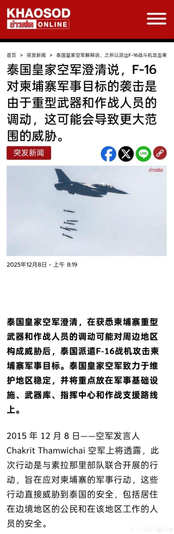 🚨特朗普宣布的停火协议破裂!据报道,泰国与柬埔寨再次在边境地区交火,两国还互相指责对方违反停火协议泰国皇家空军发言人办公室发布消息称,泰国空军出动F16空袭柬埔寨军事目标。泰国皇家空军强调,此次行动是为了回应“柬埔寨的军事行动,这些行动直接威胁到泰国的国家安全、边境地区居民的安全以及在该地区活动的泰国人员的安全”。声明指出:“根据作战评估,柬埔寨已调动重型武器、重新部署作战部队并准备了火力支援力量——这些活动可能导致军事行动升级,并对泰国边境地区构成威胁。”据泰媒报道,泰国教育部已下令关闭泰柬边境5个省份的641所学校。