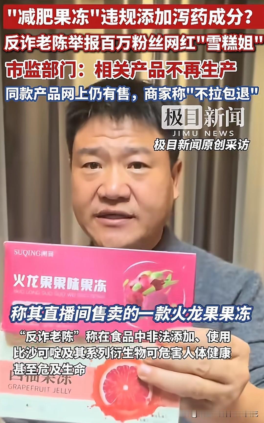 某手的百万粉丝网红“雪糕姐”被老陈打假,直播售卖的火龙果果冻违规添加泻药成分!目前“雪糕姐”已停止所有商业行为。 从“雪糕姐”的简介来看,对粉丝非常负责,只推荐自己好的东西,拒绝AB货厂家,会用小号抽查,可是结果呢?只推荐利润高的产品,品控这一块根本就是说给家人们听的,觉得好就是好,所谓的小号抽查无非就是当托儿,给自己带货的产品刷好评。 “雪糕姐”的翻车,不是老陈随便喊话就能成的,都是品控不行,追求暴利,把家人们当韭菜疯狂的收割,翻车只是时间问题。这也是很多明星不再带货的原因。