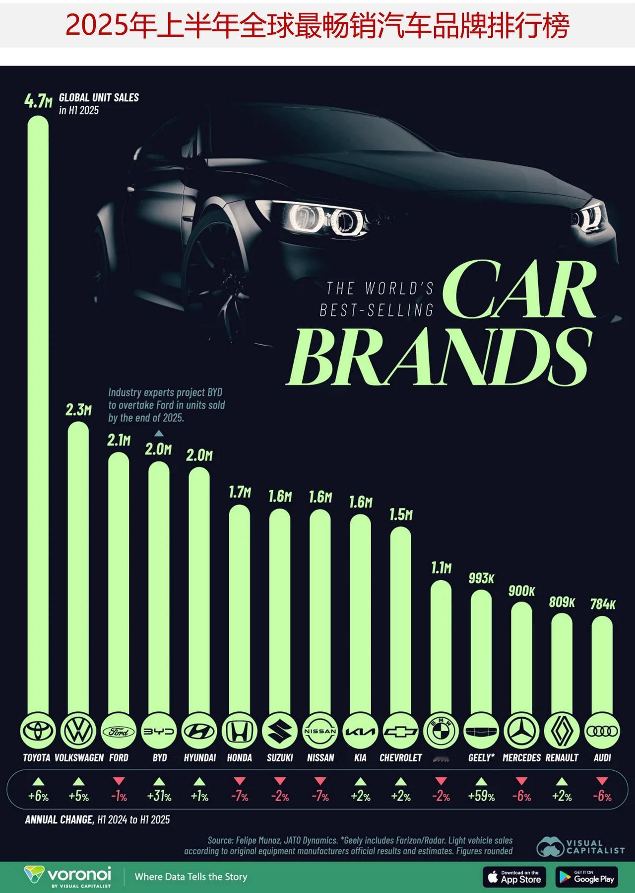 2025年上半年全球最畅销汽车品牌排行榜,比亚迪在排名中迅速攀升 全球汽车销量持续变动,传统品牌为保住市场份额而与迅速发展的电动汽车制造商展开竞争。在 2025 年上半年,丰田再次以巨大优势在全球市场占据领先地位,而几家亚洲汽车制造商在前 15 名中也占据了稳固的位置。此图表展示了各汽车制造商的表现,通过单位销量与年增长率进行了对比。 一个显著的趋势是,中国的制造商正在崛起,尤其是比亚迪和吉利,它们不仅在国内市场扩张,在国际市场上也取得了长足发展。它们的迅猛增长与欧洲和日本一些老牌品牌所经历的下滑形成了鲜明对比。 此图数据来源于行业分析师费利佩·穆尼奥斯,他负责汇总官方制造商的销售数据以及全球轻型汽车市场的预测数据。这些数据涵盖了内燃机汽车和电动汽车。 ——丰田的全球领先地位显著 丰田在 2025 年上半年的销量是大多数竞争对手的两倍多,达到了 473 万辆。这一成绩意味着同比增长了 6%,进一步巩固了丰田在从北美到亚洲等各个市场的优势地位。尽管汽车行业仍在持续推进电动化进程,但丰田广泛的车型阵容和全球生产规模仍为其保持领先地位提供了有力支持。 ——比亚迪在排名中迅速攀升 比亚迪在全球排名第四,销量超过 200 万辆,但其年增长率高达 31%,远超其他所有主要品牌。按照目前的发展态势,行业专家预计比亚迪将在 2025 年底超越福特。 这种增长势头既反映了中国电动汽车行业的蓬勃发展,也体现了比亚迪积极的国际扩张战略,尤其是在欧洲和拉丁美洲地区。 ——各传统汽车制造商表现参差不齐 几家老牌品牌销量出现下滑,其中包括本田、日产、梅赛德斯和奥迪,它们的销量分别下降了 2%至 7%。欧洲的高端品牌也因主要市场的需求减弱而失去了部分市场份额。与此同时,现代、起亚和雪佛兰则实现了小幅增长。