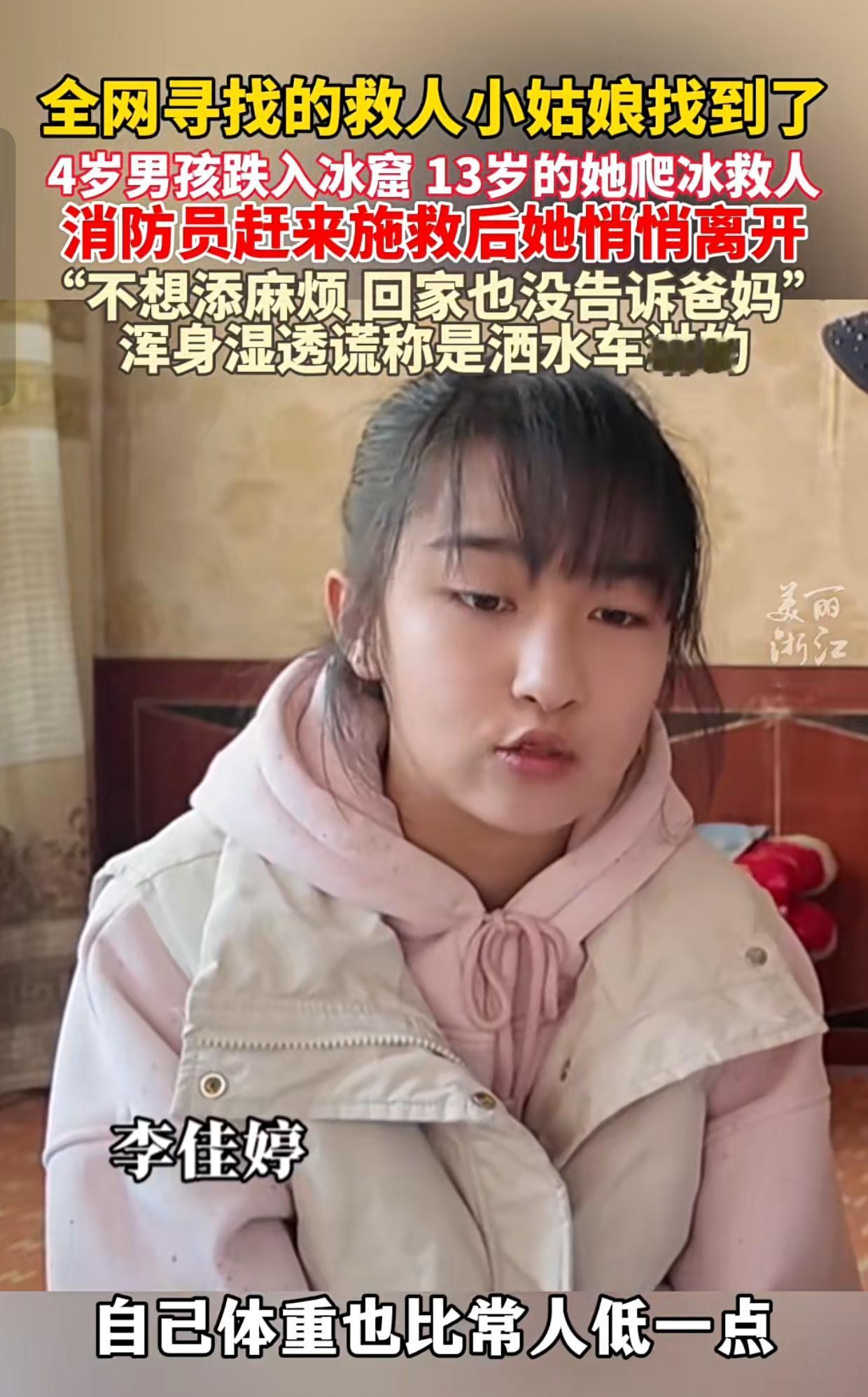 全网找的冰窟救人女孩找到了!13岁的她,藏着最动人的勇敢 宁夏吴忠的冰面下,藏着一个13岁女孩的滚烫心意。 12月6日下午3点,豫海湖的冰面突然裂开一道口子,4岁男童像断线的风筝般坠入刺骨的湖水。岸边的大人慌成一团,呼喊声刺破寒冬——谁也不敢贸然上前,薄冰在脚下发出危险的咯吱声。 就在这时,一个骑着自行车的身影猛地停下。13岁的李佳婷甩下车,盯着冰窟里挣扎的孩子,对男童母亲说:“姨姨,我身体轻,我下去救!” 她接过一根管子,趴在冰面上一点点往前挪,羽绒服被寒风灌得鼓鼓的。离冰窟还有两步远时,脚下的冰“咔嚓”碎裂,李佳婷瞬间坠入水中,冰冷的湖水瞬间浸透了她的衣服。 可她手里的管子,始终朝着男童的方向伸过去。 直到消防员赶到,将两个孩子从冰窟里拉出来,男童3点40分脱离危险,李佳婷才悄悄爬起来,拧了拧湿透的衣服,骑上自行车消失在人群里。 回家后,父亲看着她冻得发紫的嘴唇和湿透的棉袄,皱眉追问。她低着头,小声说:“路上被洒水车淋到了。” 若不是姑姑刷到救人视频,指着屏幕里那个瘦小的身影喊“这不是佳婷吗”,这个秘密或许会永远藏在她心里。 被救男童的家长带着酬金、水果和羊羔肉上门,李佳婷的父亲红着眼眶把钱推回去:“娃做了该做的事,要钱就生分了。”学校说,要在升国旗时给她披红绸,还要申报见义勇为——这个平时爱帮同学讲题、放学帮奶奶喂羊的姑娘,这下成了全校的骄傲。 网友们看着视频里那个趴在冰面上的小小身影,心都揪紧了: “13岁啊,自己还是个孩子,却敢往冰窟里冲” “她撒谎说被洒水车淋湿时,心里一定觉得这没什么” “这才是刻在骨子里的善良,不图啥,就想让那个小弟弟活着” 寒冬里的冰窟很冷,但总有人用热血把它焐热。李佳婷没说过什么豪言壮语,可她趴在冰面上的那一刻,就活成了最勇敢的模样。 你身边有这样默默发光的普通人吗?评论区讲讲他们的故事~